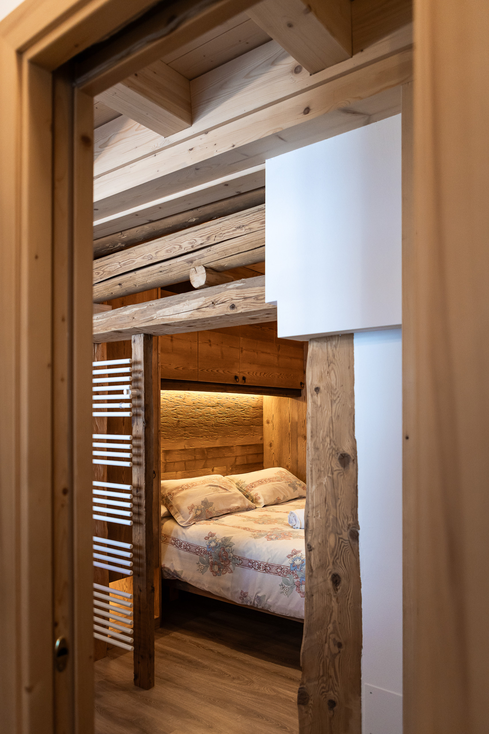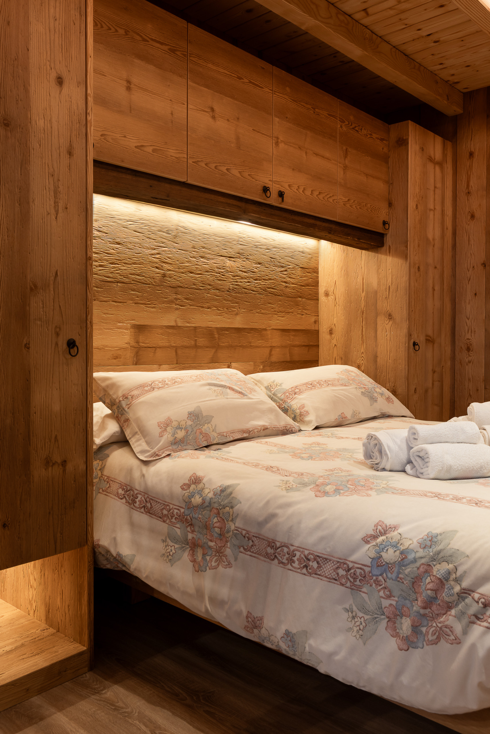 Camera da Letto: uno spazio accogliente e romantico con un elegante letto queen size, ideale per riposare dopo giornate di avventure montane. La camera è progettata per garantire il massimo relax e la serenità che ogni coppia merita, creando l'atmosfera perfetta per momenti di pura intimità.