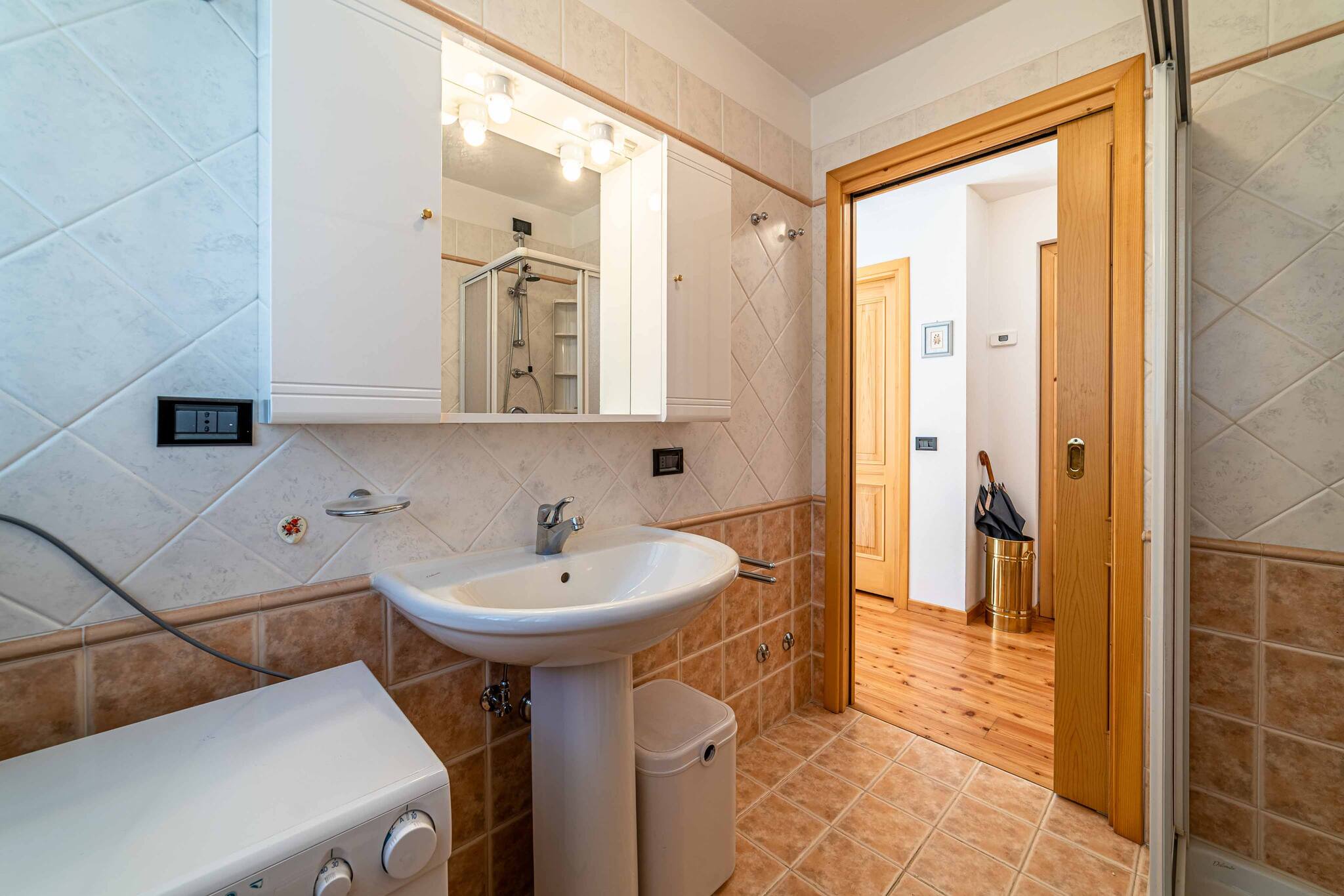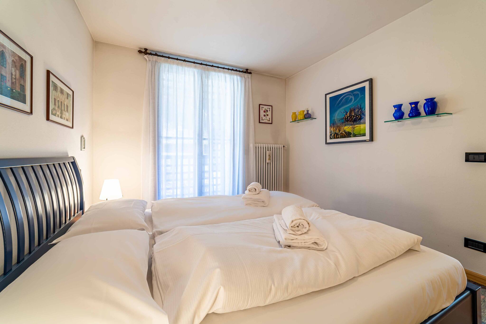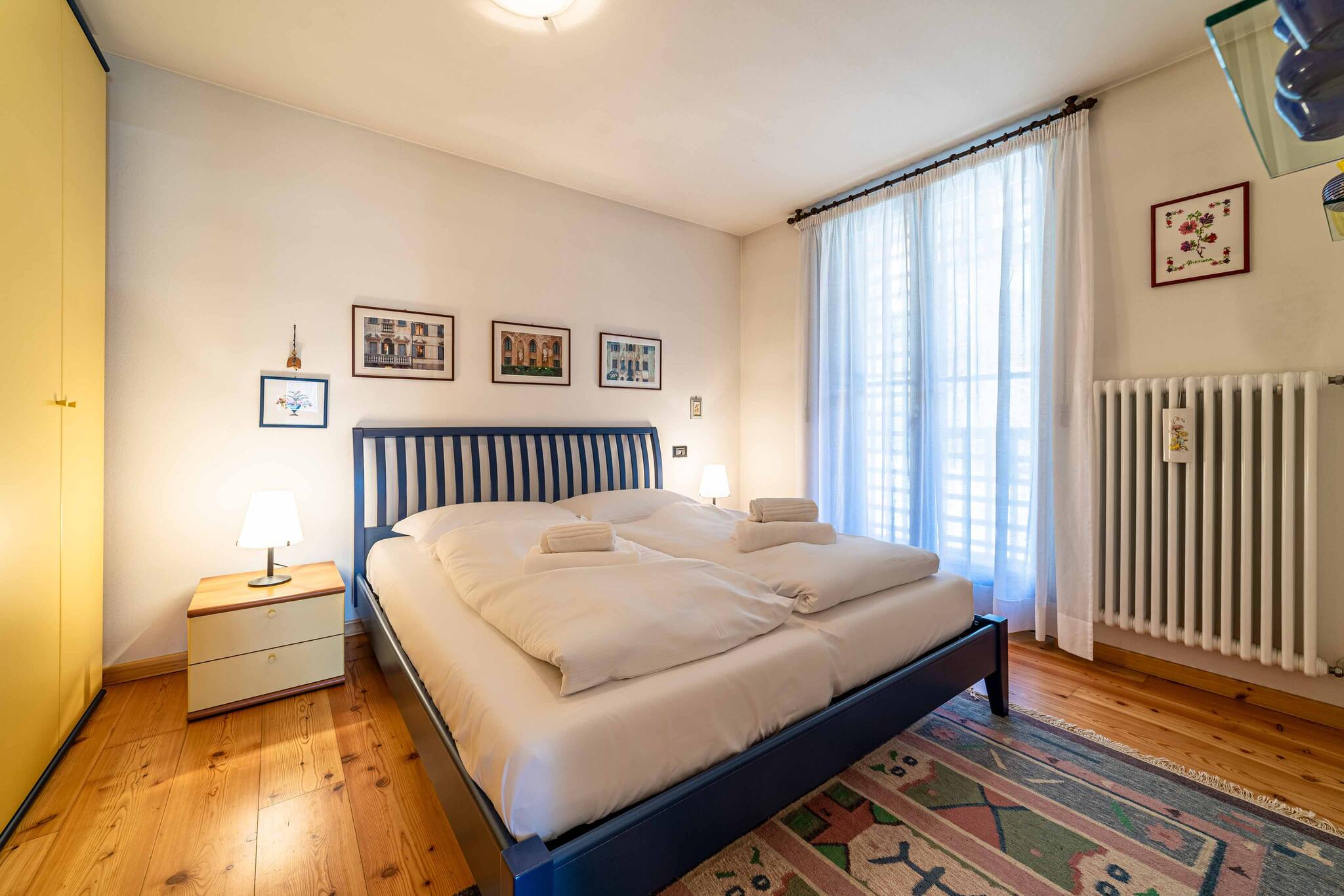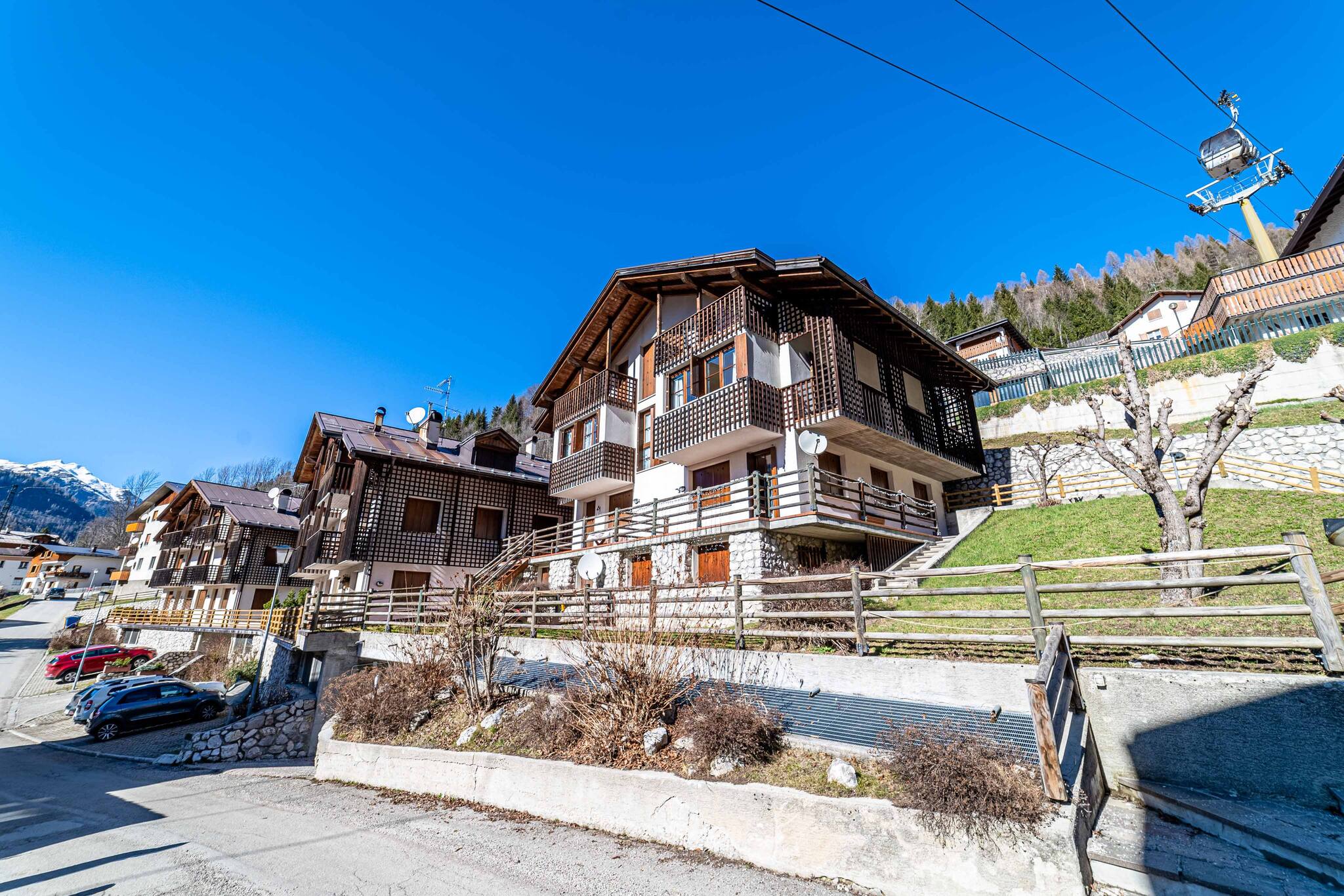L’appartamento è composto da una zona giorno luminosa con cucina e soggiorno, una camera matrimoniale, una camera doppia, due bagni (uno con doccia, l’altro con vasca da bagno) e un poggiolo che regala scorci rilassanti sulle montagne. L’ambiente è curato nei dettagli, pensato per offrire una permanenza piacevole in ogni stagione.