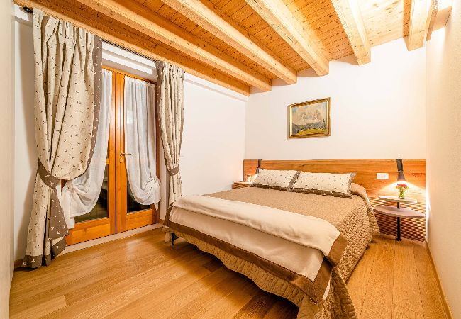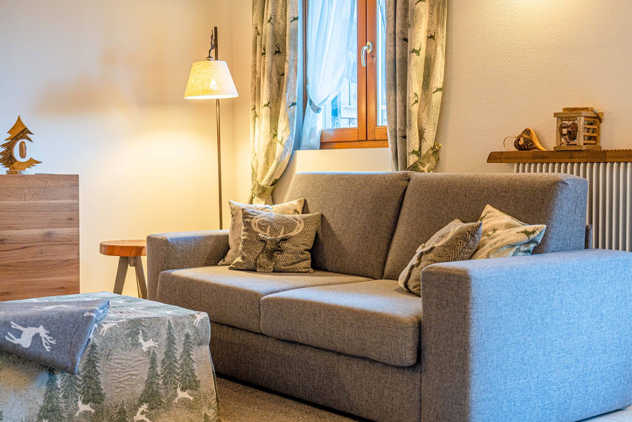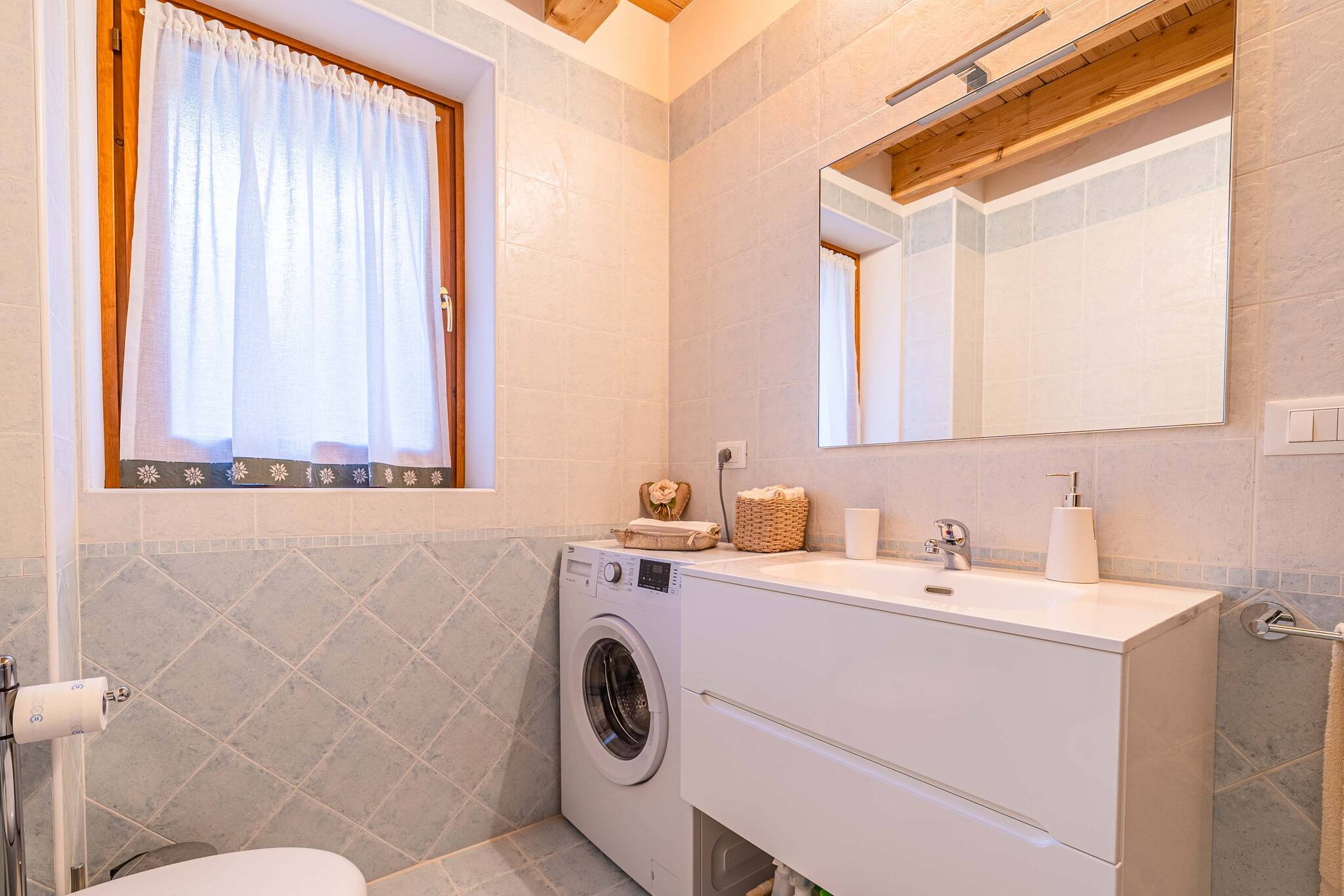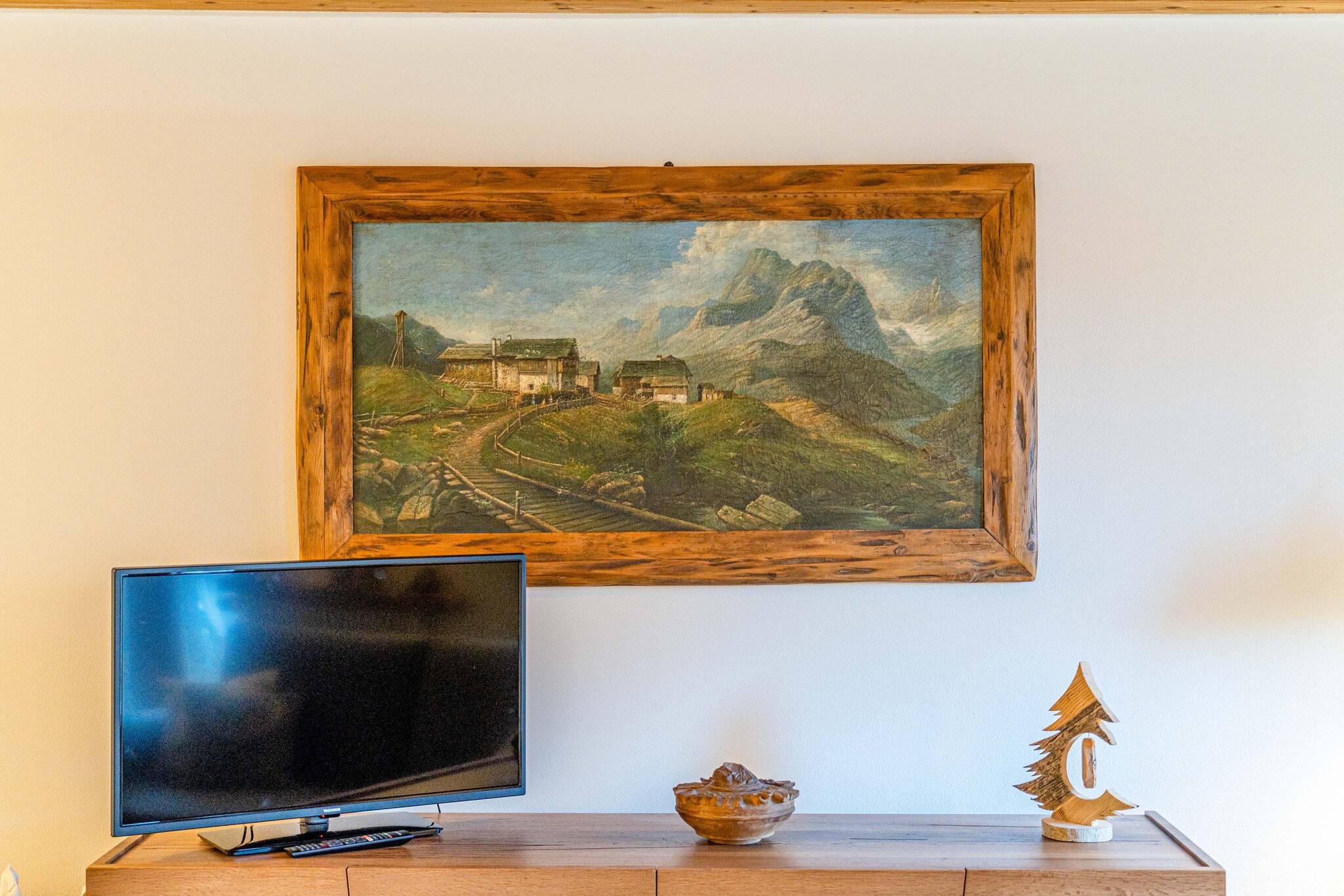 L’appartamento è composto da una zona giorno luminosa con cucina e soggiorno, una camera matrimoniale, una camera doppia, due bagni (uno con doccia, l’altro con vasca da bagno) e un poggiolo che regala scorci rilassanti sulle montagne. L’ambiente è curato nei dettagli, pensato per offrire una permanenza piacevole in ogni stagione.