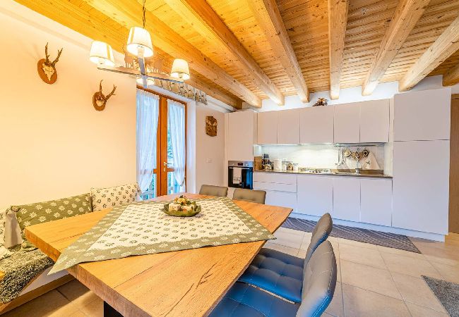 L'appartamento può ospitare fino a 4 persone ed è composto da una zona giorno con cucina e soggiorno, una camera matrimoniale, una camera doppia, due bagni moderni con doccia e un ampio terrazzo esterno dove godersi l’aria fresca e il panorama montano.
