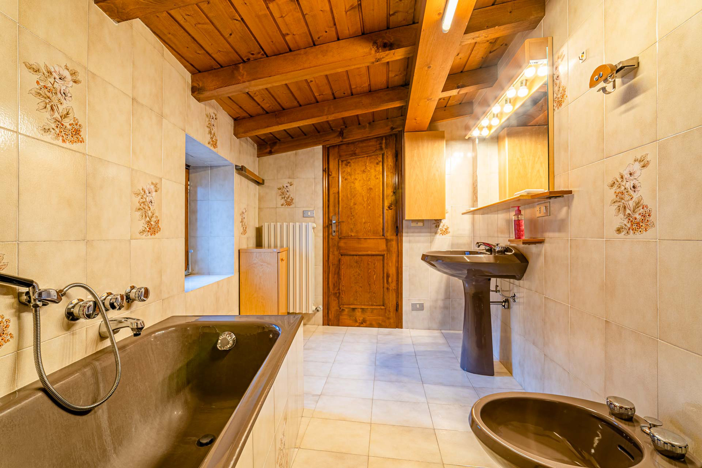 L’appartamento è composto da una zona giorno luminosa con cucina e soggiorno, una camera matrimoniale, una camera doppia, due bagni (uno con doccia, l’altro con vasca da bagno) e un poggiolo che regala scorci rilassanti sulle montagne. L’ambiente è curato nei dettagli, pensato per offrire una permanenza piacevole in ogni stagione.