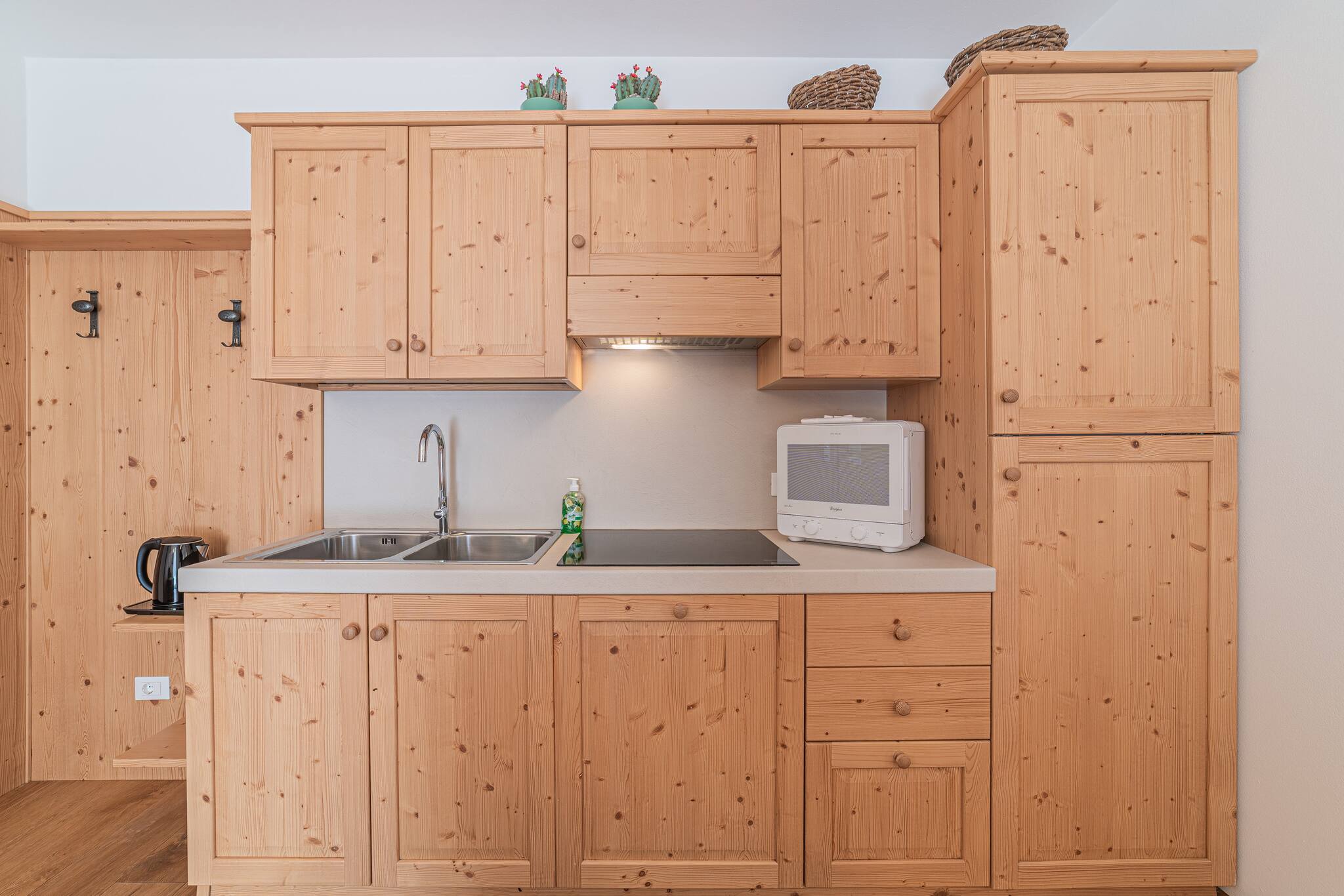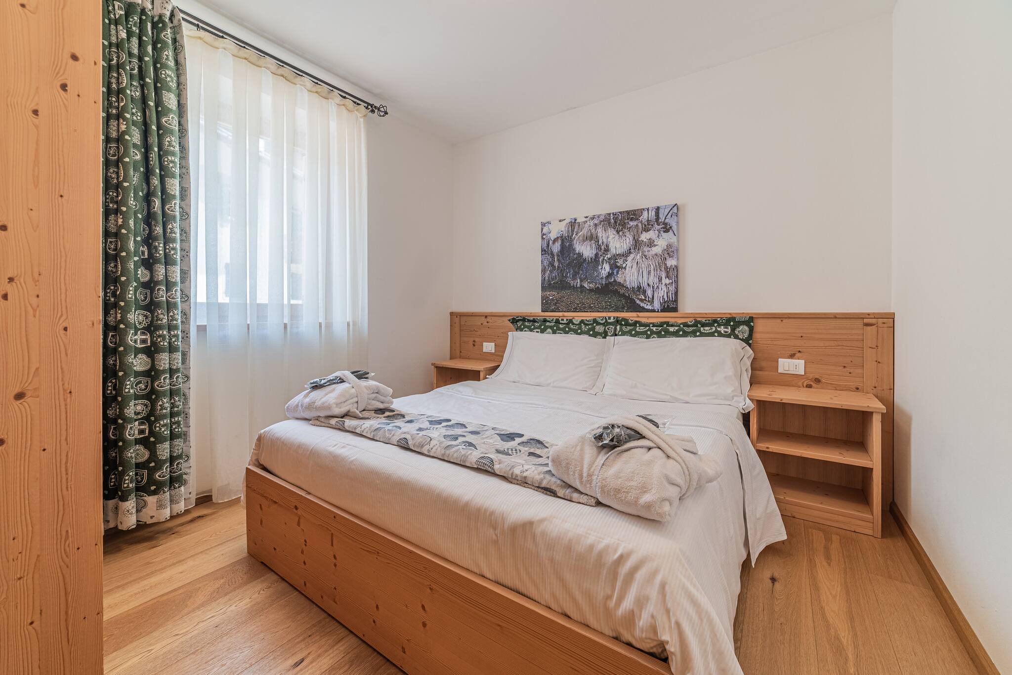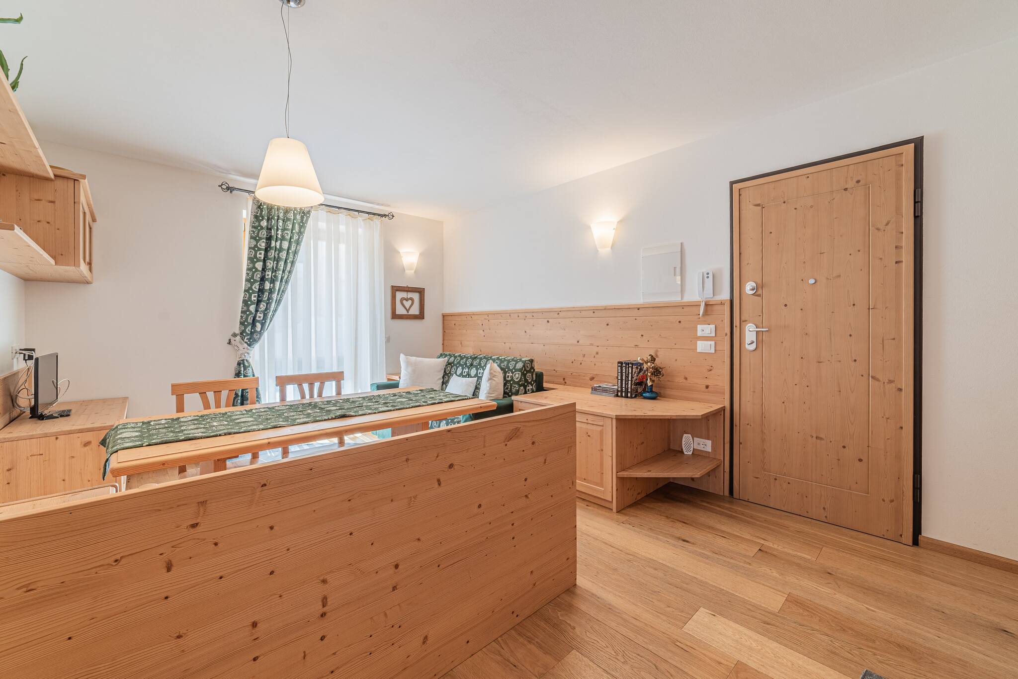 L'appartamento si compone di un luminoso soggiorno con angolo cottura a induzione, una camera matrimoniale spaziosa, un bagno moderno e un terrazzo panoramico dove godere di splendide viste montane. Lo stile semplice ma curato regala un’atmosfera calda e rilassante.