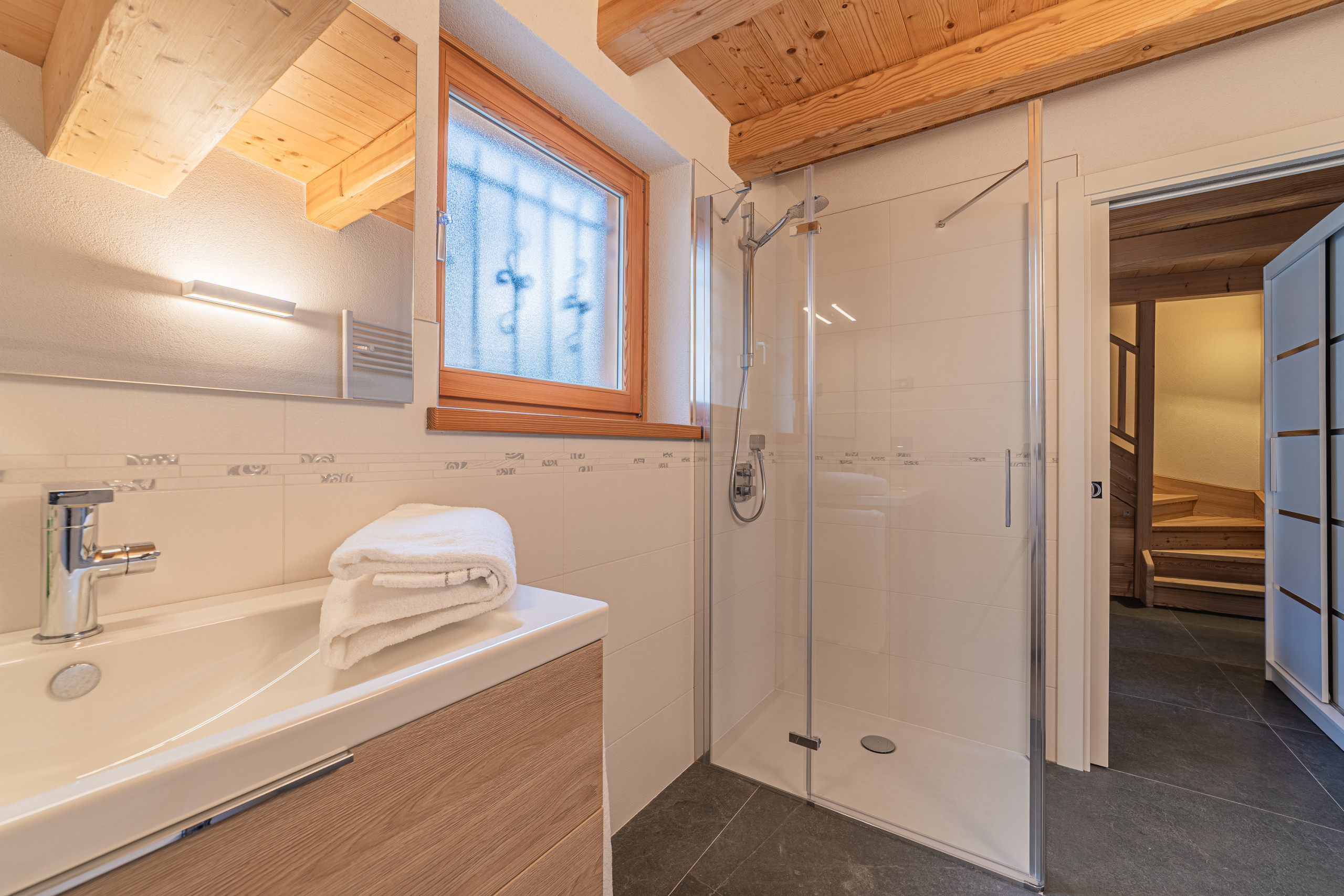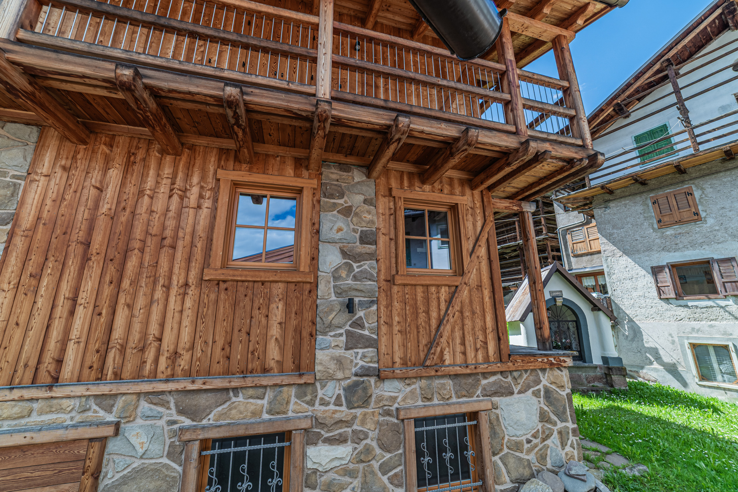 Al piano terra troverete un comodo bagno con doccia, perfetto per rinfrescarsi dopo una giornata di escursioni o sci. Salendo al primo piano, vi accoglie una cucina abitabile ben attrezzata, pensata per preparare ogni pasto con facilità. Il secondo piano ospita la camera matrimoniale con travi a vista e un piccolo bagno aggiuntivo con wc e lavandino.