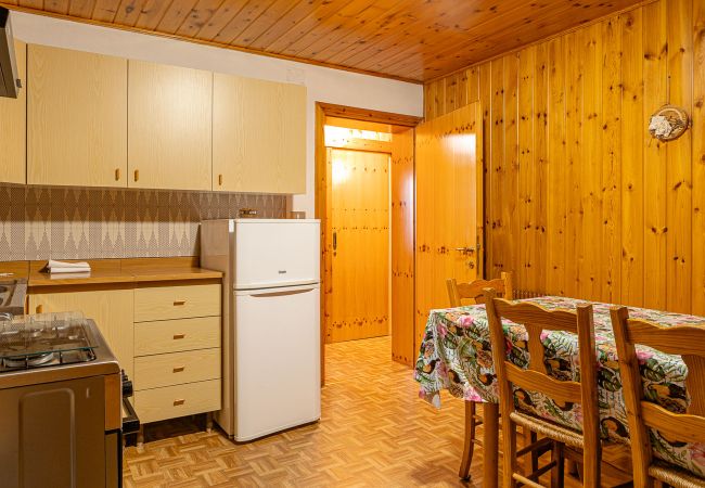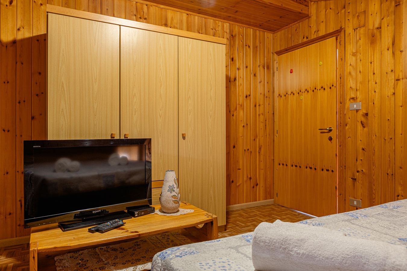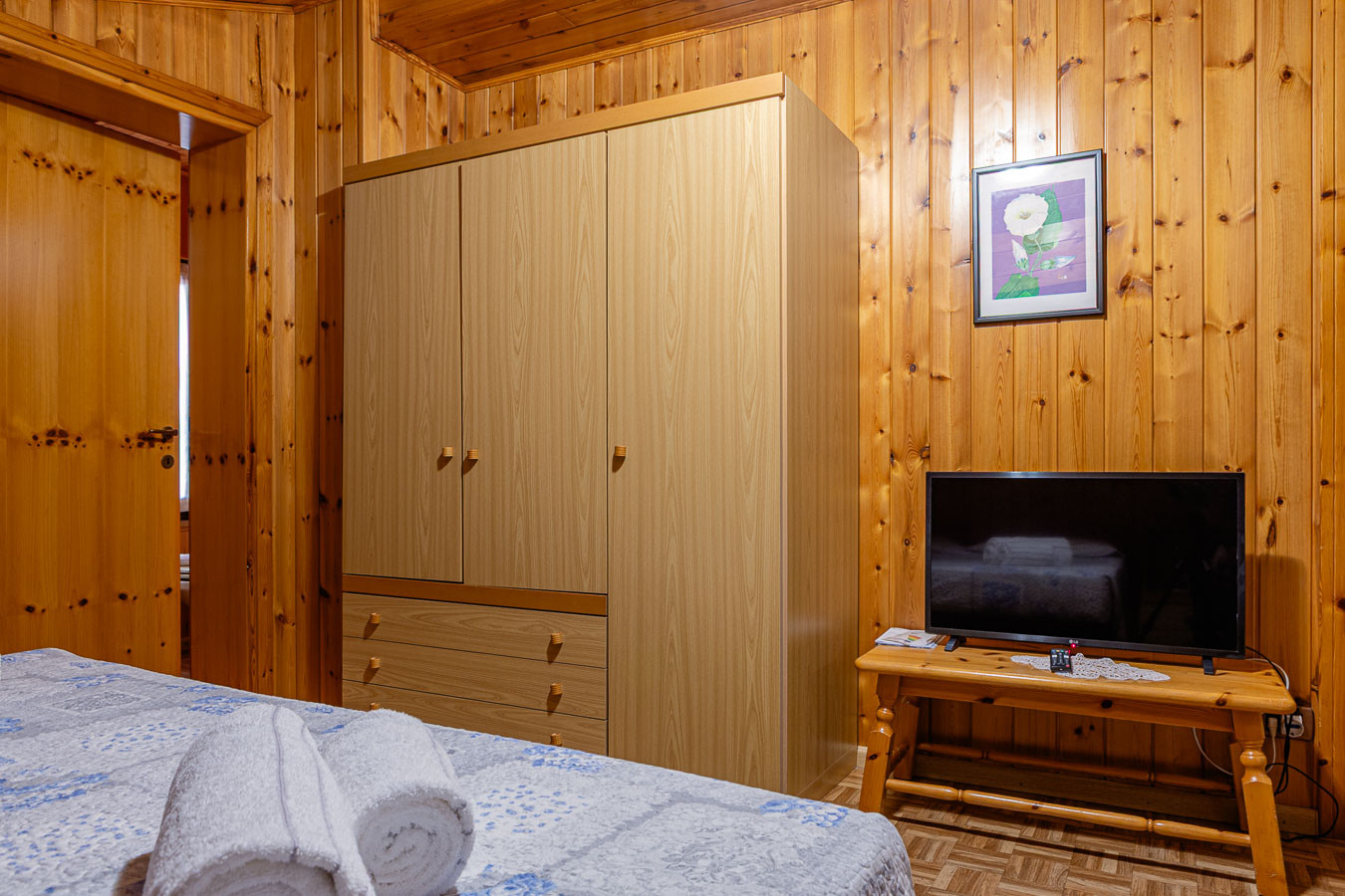 L’appartamento è composto da una cucina attrezzata e una zona soggiorno con divano letto matrimoniale. La camera principale è dotata di due letti a castello, mentre il bagno è comodo e completo di tutti i servizi essenziali. All’esterno, un terrazzo offre uno spazio rilassante con vista sul verde e sulle montagne.