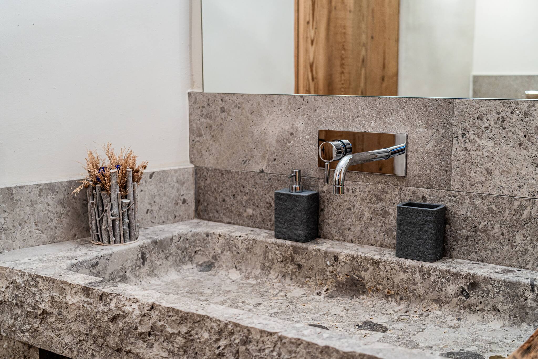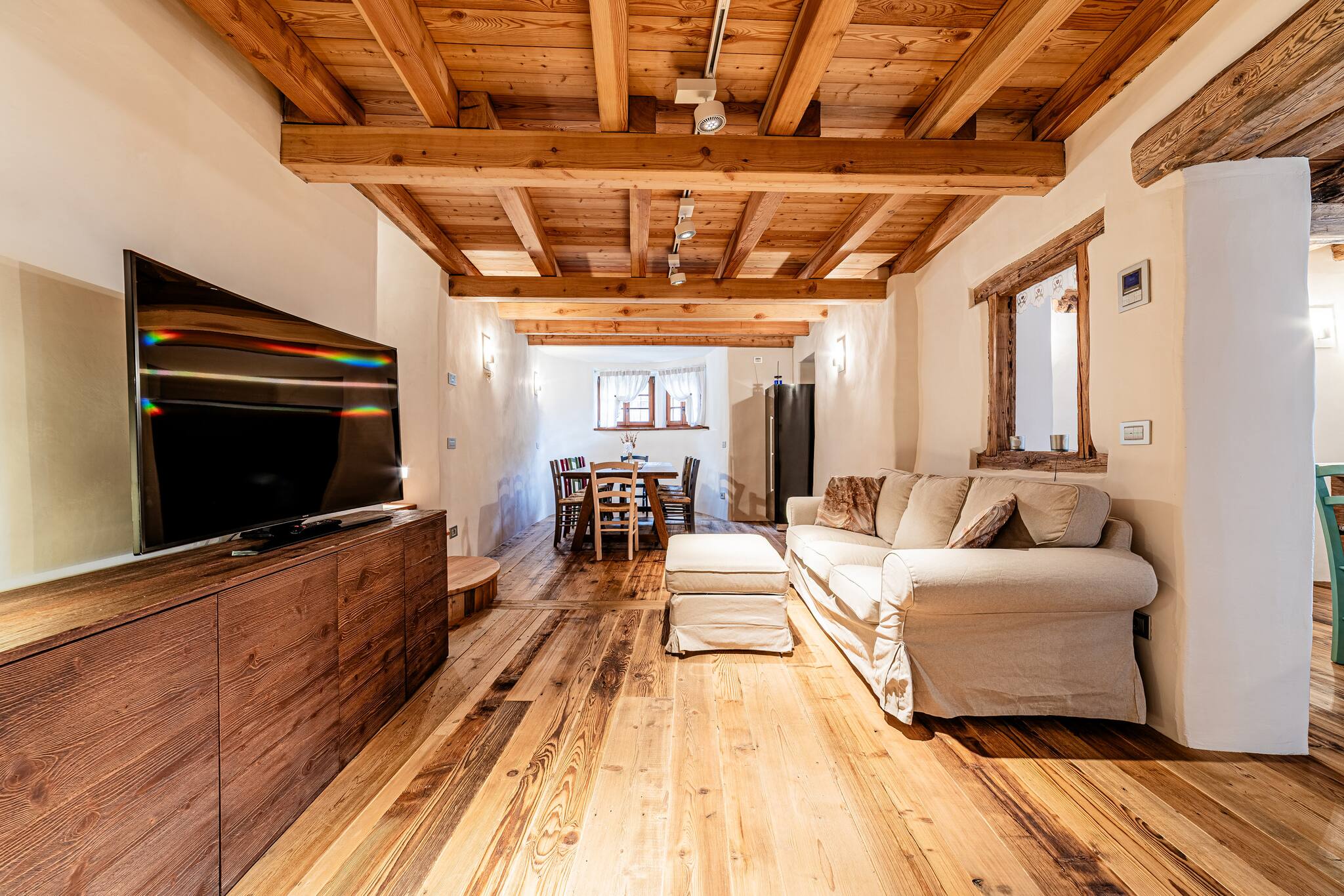 Situato al piano terra, l’appartamento è composto da una cucina completamente attrezzata, un accogliente salotto, una camera matrimoniale e un bagno con lavabo in pietra. A completare la proprietà, un deposito sci o bici, ideale per gli amanti delle attività all’aria aperta.