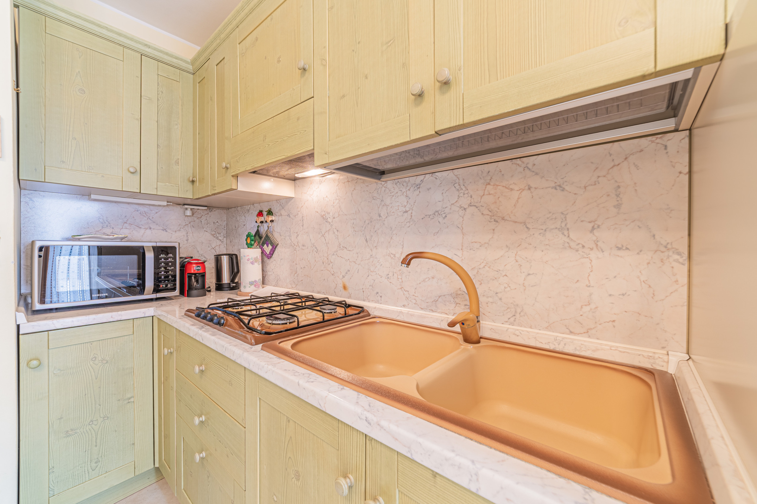Die 35 m² große Wohnung bietet eine intime und sorgfältig gestaltete Umgebung mit besonderer Aufmerksamkeit für Details. Der Wohnbereich verfügt über eine elegante amerikanische Küche, die vollständig ausgestattet ist und mit allen wesentlichen Haushaltsgeräten wie Kühlschrank, Geschirrspüler, Kaffeemaschine und Mikrowelle ausgestattet ist, ideal zum Zubereiten schneller Mahlzeiten oder leckerer Frühstücke.