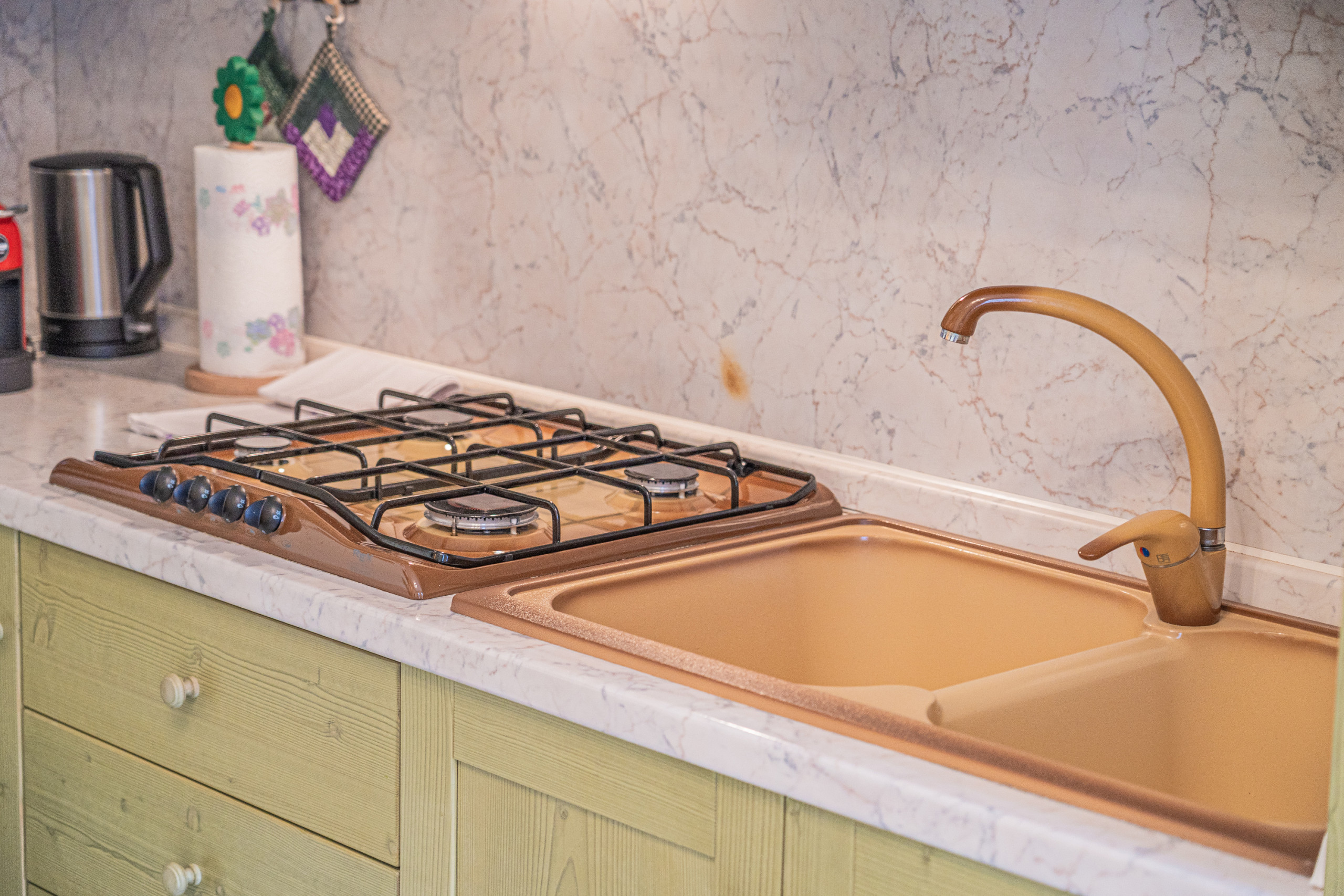 - Wohnzimmer mit Küchenzeile, ausgestattet mit Kühlschrank mit Gefrierfach, Gasherd, Mikrowelle, Wasserkocher und Lavazza Kapselkaffeemaschine.