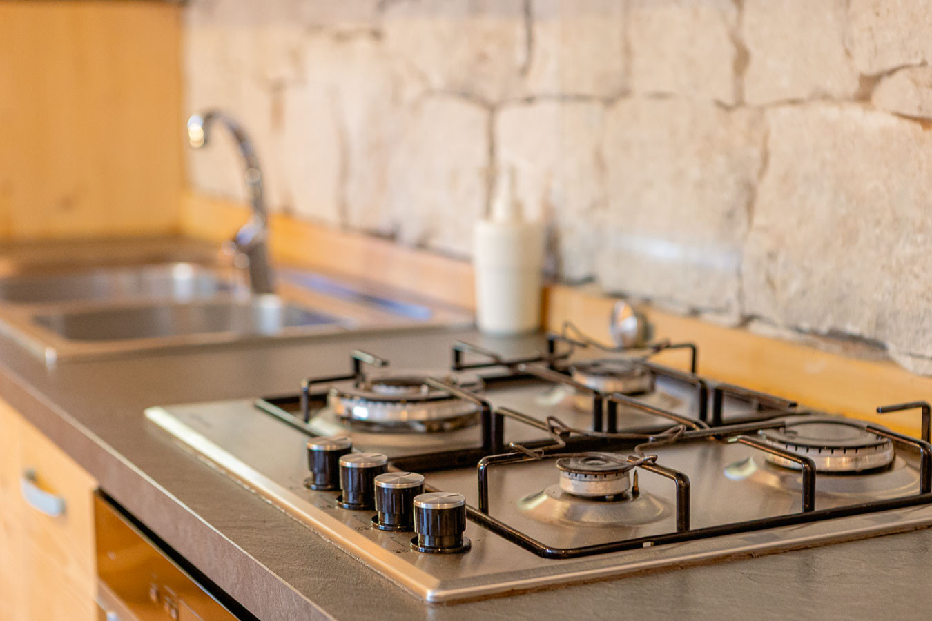 Die Offene Küche mit Gas-Kochfeld ist ausgestattet in einen Kühlschrank, eine Mikrowelle, ein Backofen, Gefrierschrank, eine Spülmaschine, Geschirr/Besteck, Kochutensilien, eine Kaffeemaschine, einen Wasserkocher und Herdplatte.