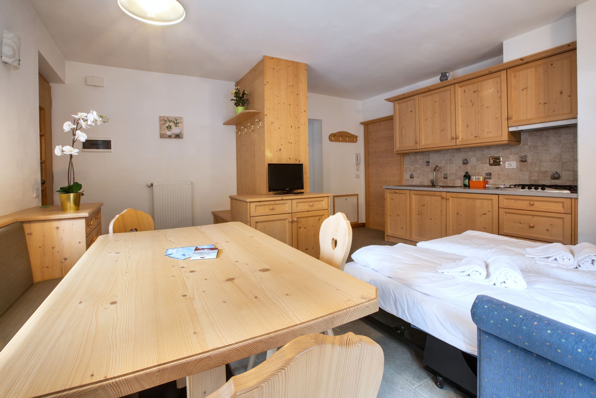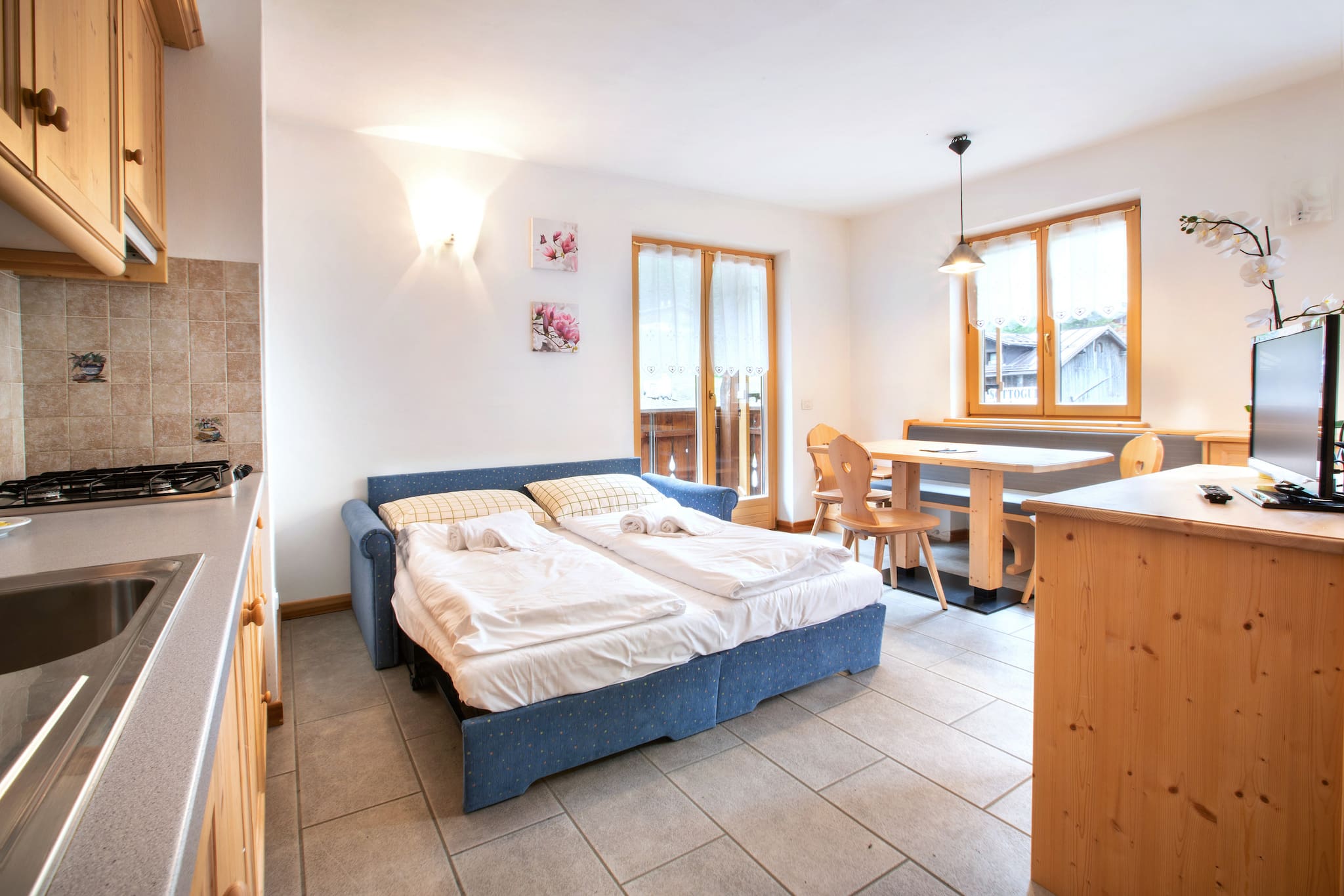 Die Wohnung bietet Platz für bis zu 4 Personen und verfügt über sorgfältig gestaltete und funktionale Räume: einen Wohn- und Küchenbereich mit ausgestatteter Küche, zwei Doppelzimmer, ein modernes Badezimmer und eine private Terrasse, um die Aussicht und die frische Bergluft zu genießen.