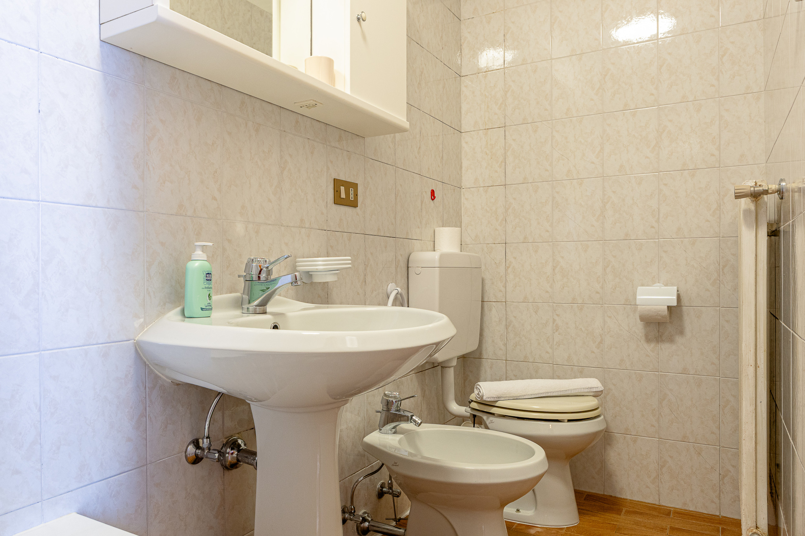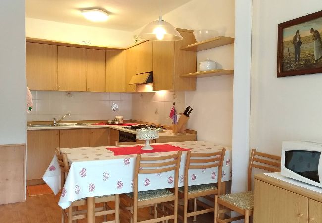 Die Wohnung besteht aus einer ausgestatteten Küche und einem Wohnbereich mit Doppelbettsofa. Das Hauptschlafzimmer verfügt über zwei Stockbetten, während das Badezimmer bequem und mit allen wesentlichen Annehmlichkeiten ausgestattet ist. Im Freien bietet eine Terrasse einen entspannenden Raum mit Blick auf Grün und Berge.