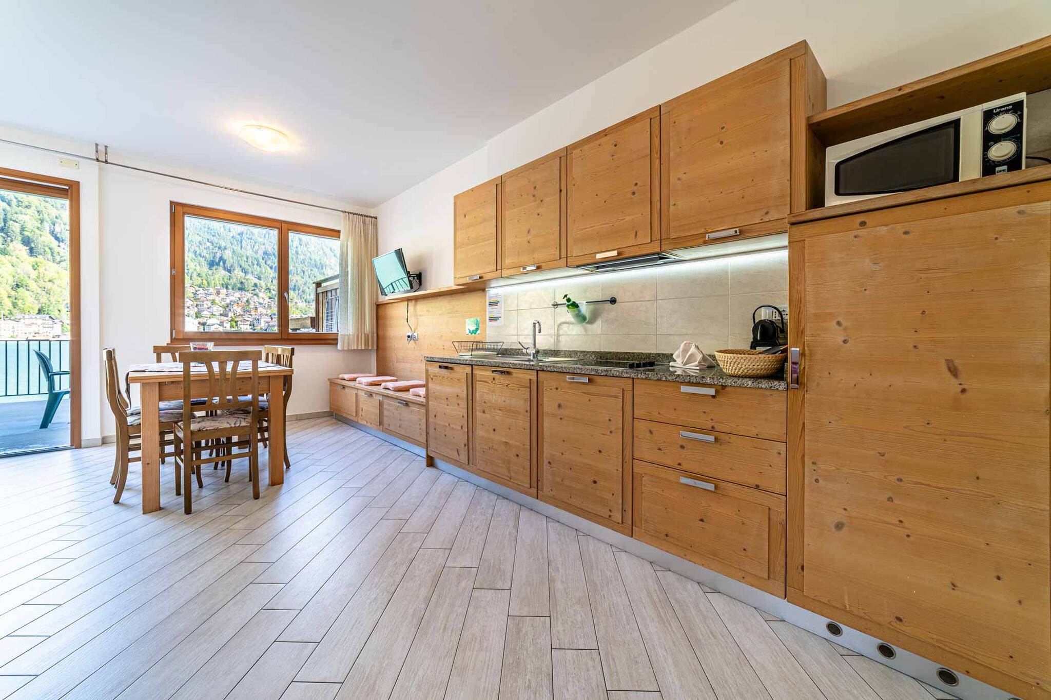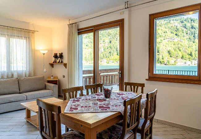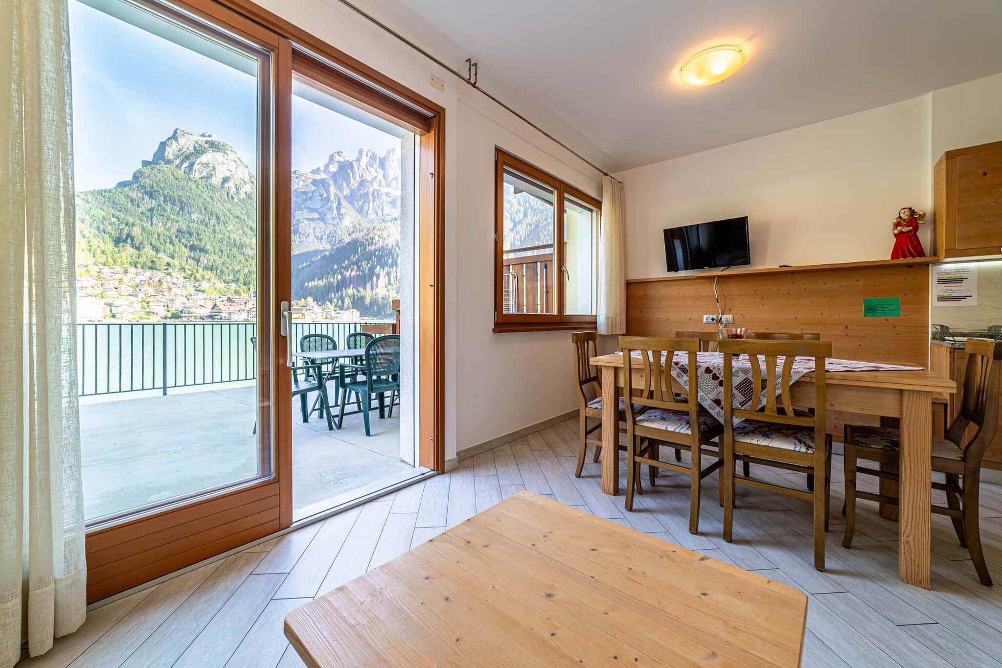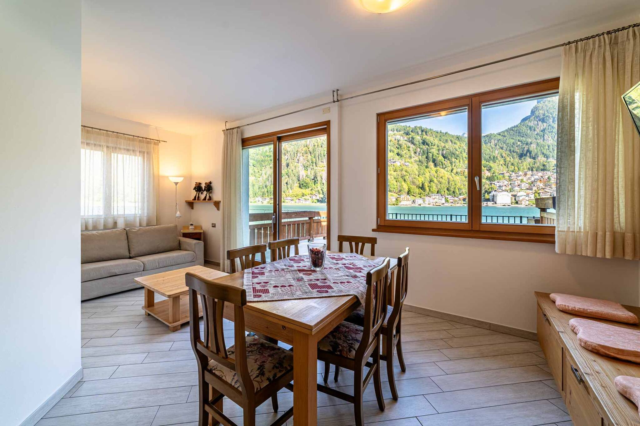 Diese Wohnung hat 2 Schlafzimmer, eine Schlafcouch im Wohnzimmer und eine große Terrasse am See, um Sonne zu tanken, im Freien zu essen, den Sonnenuntergang über dem Civetta zu bewundern, der abends rosa wird (ein Spektakel)