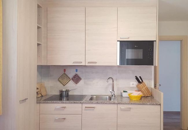 Die Wohnung besteht aus einer ausgestatteten Küche und einem Wohnbereich mit Doppelbettsofa. Das Hauptschlafzimmer verfügt über zwei Stockbetten, während das Badezimmer bequem und mit allen wesentlichen Annehmlichkeiten ausgestattet ist. Im Freien bietet eine Terrasse einen entspannenden Raum mit Blick auf Grün und Berge.