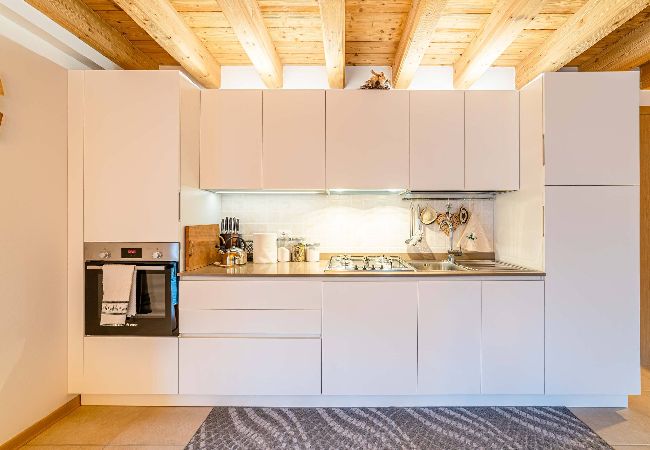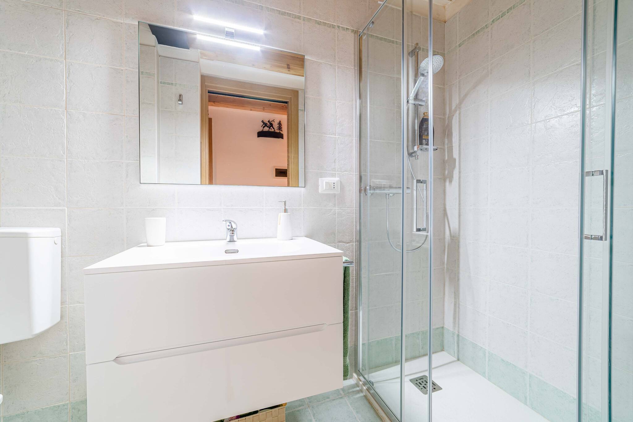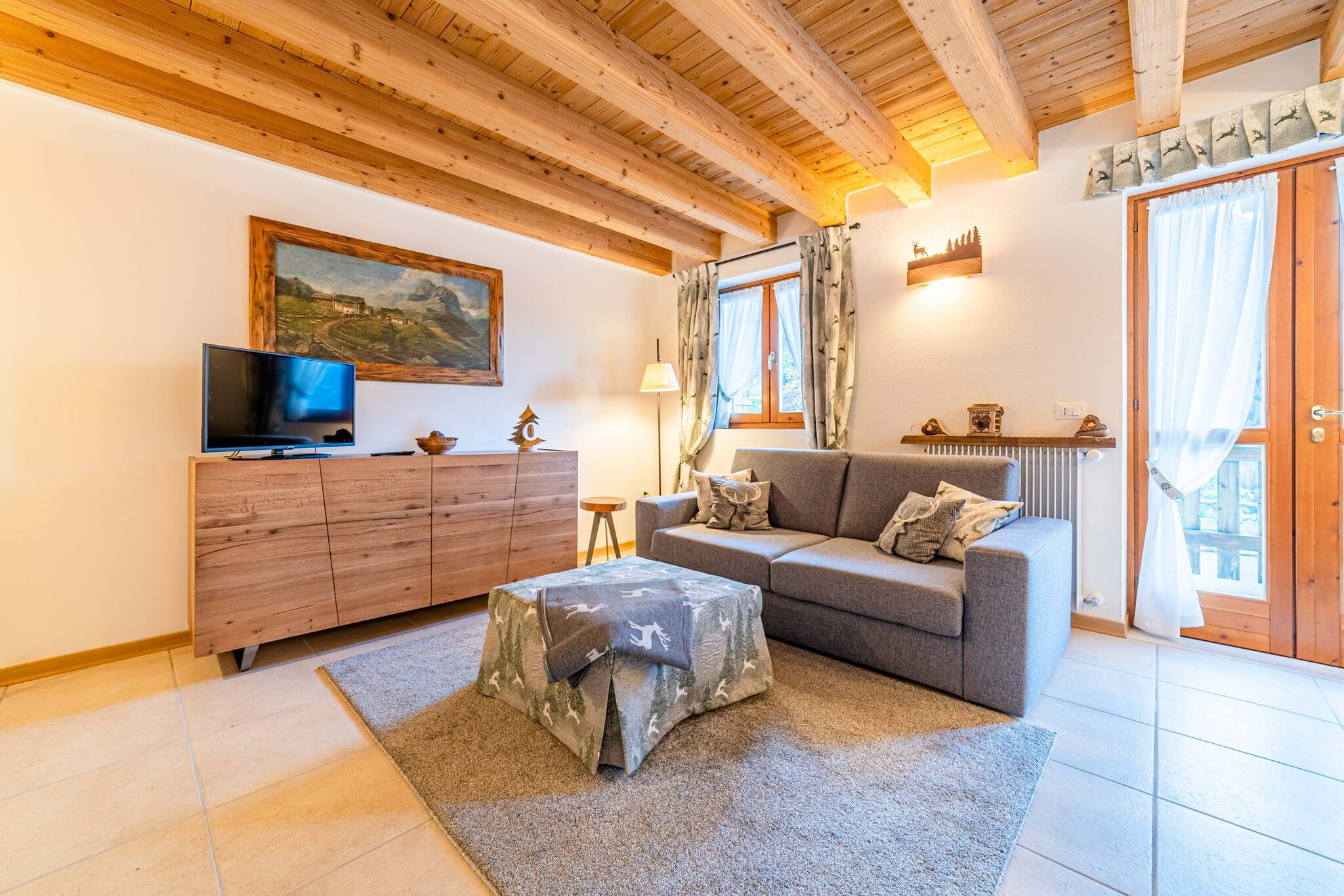 The apartment consists of a bright living area with kitchen and living room, a master bedroom, a double bedroom, two bathrooms (one with shower, the other with bathtub) and a balcony that offers relaxing views of the mountains. The environment is carefully detailed, designed to offer a pleasant stay in every season.