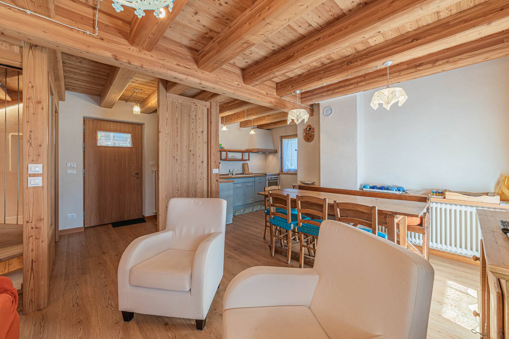 In the heart of the main square of Canale d'Agordo, this attic apartment will win you over with the warmth of ancient wood, exposed beams, and that welcoming atmosphere that only mountain houses know how to offer.
