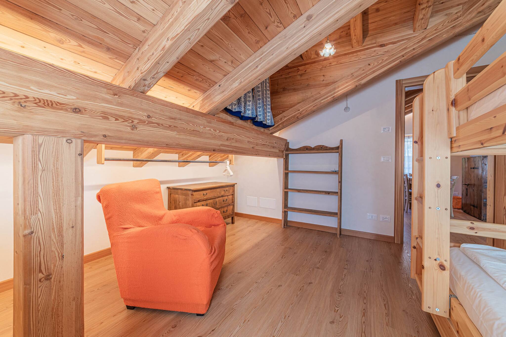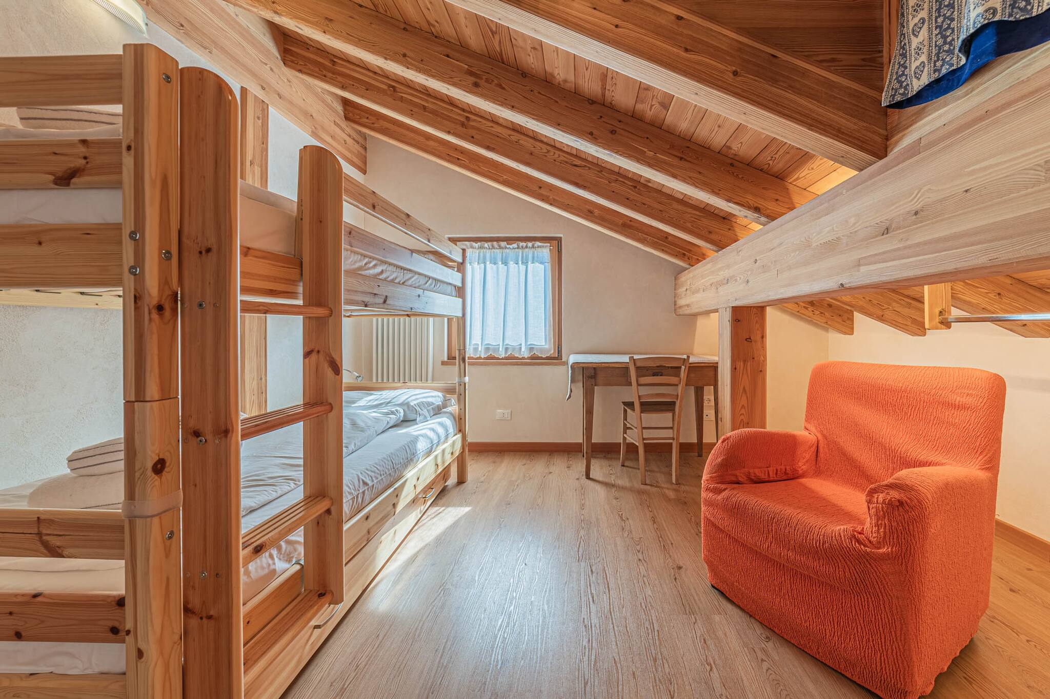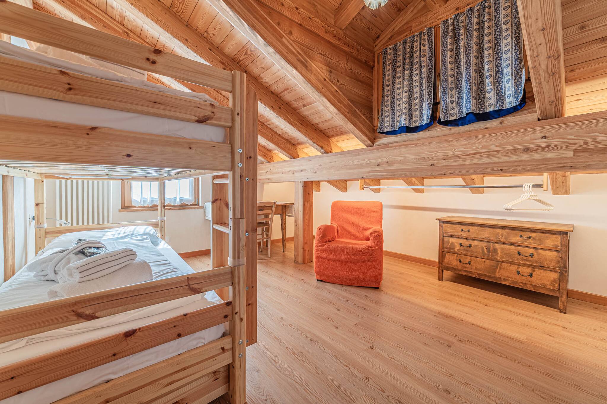 At the entrance, you will be welcomed by a bright living room with a kitchenette, furnished in alpine style and equipped with everything necessary for cooking. The sleeping area is divided into a double bedroom, a single bedroom, and a charming wooden mezzanine with an additional bed: a perfect corner for children or to relax reading a book. The bathroom is functional and has a window.