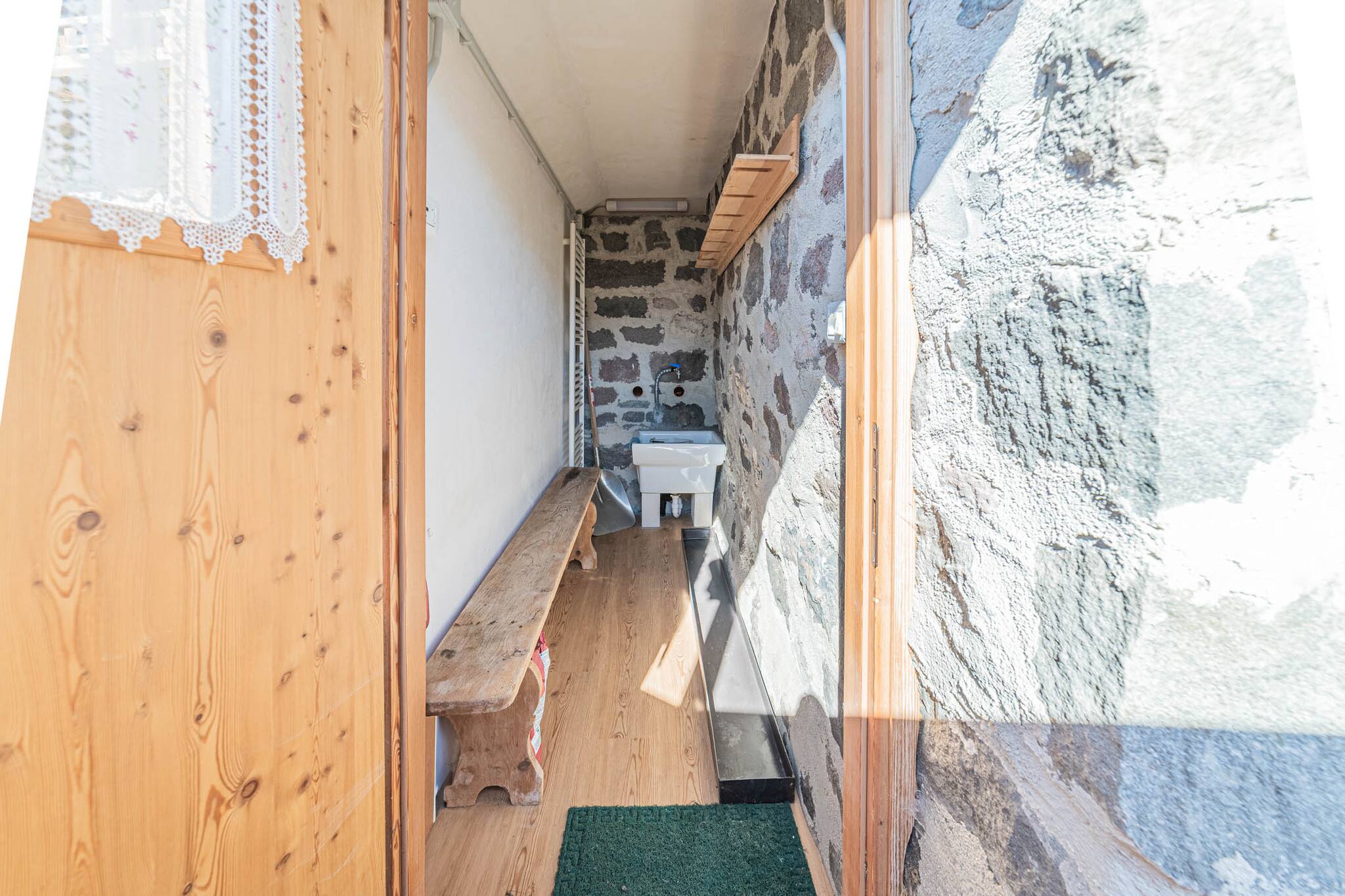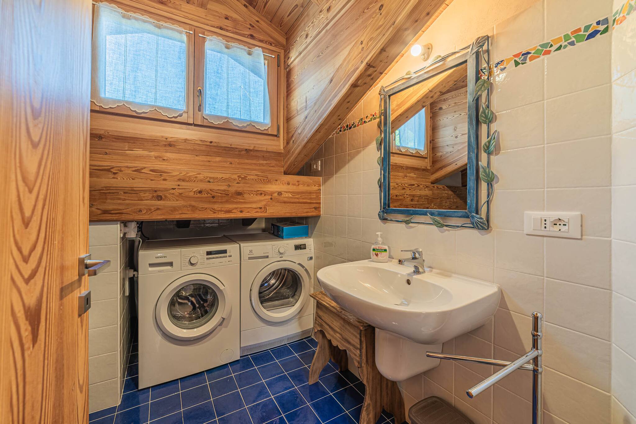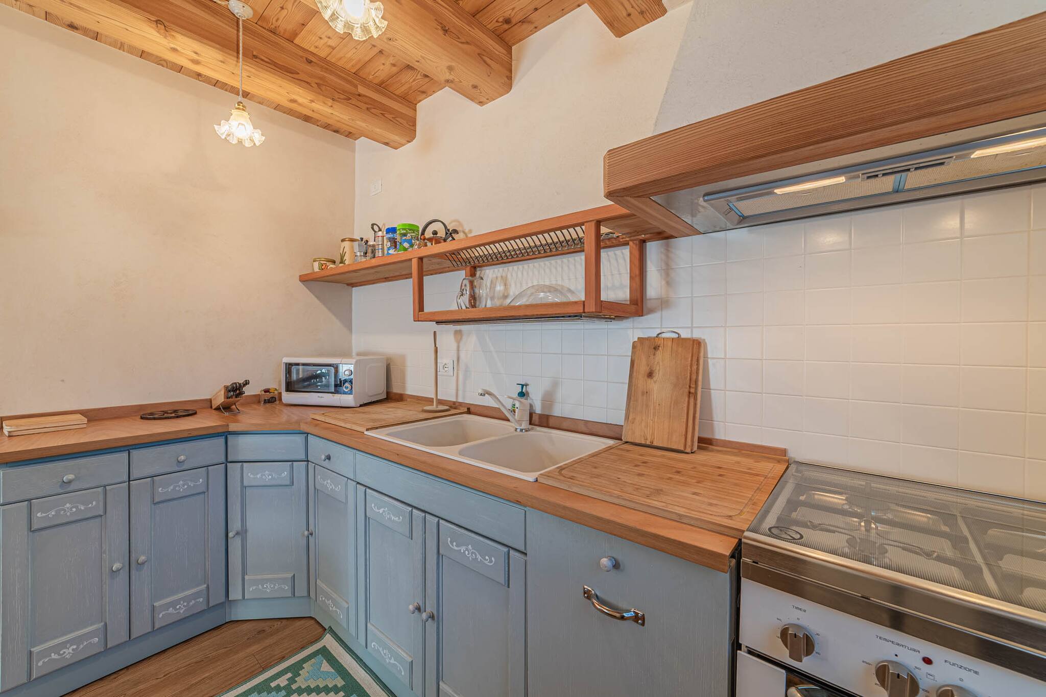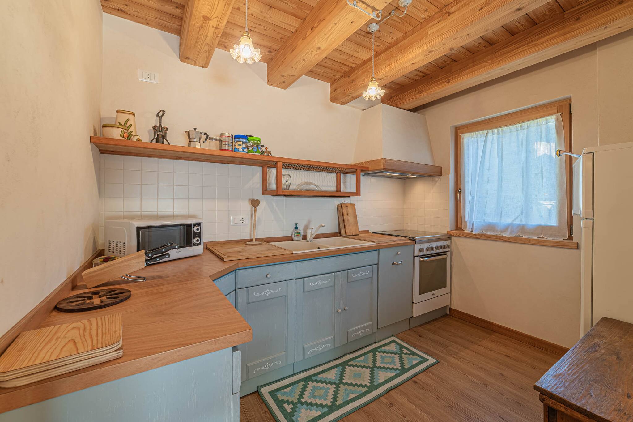 At the entrance, you will be welcomed by a bright living room with a kitchenette, furnished in alpine style and equipped with everything necessary for cooking. The sleeping area is divided into a double bedroom, a single bedroom, and a charming wooden mezzanine with an additional bed: a perfect corner for children or to relax reading a book. The bathroom is functional and has a window.