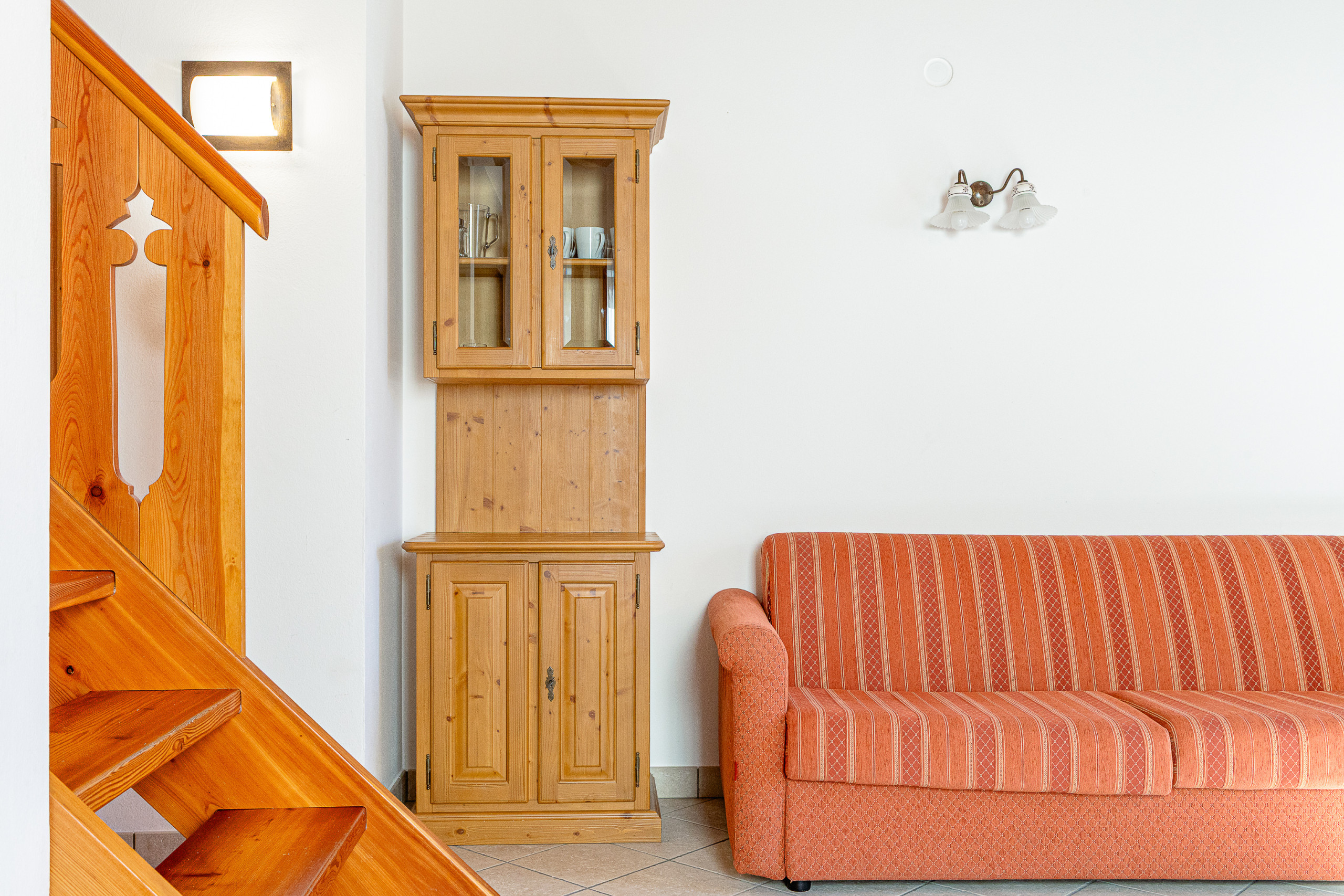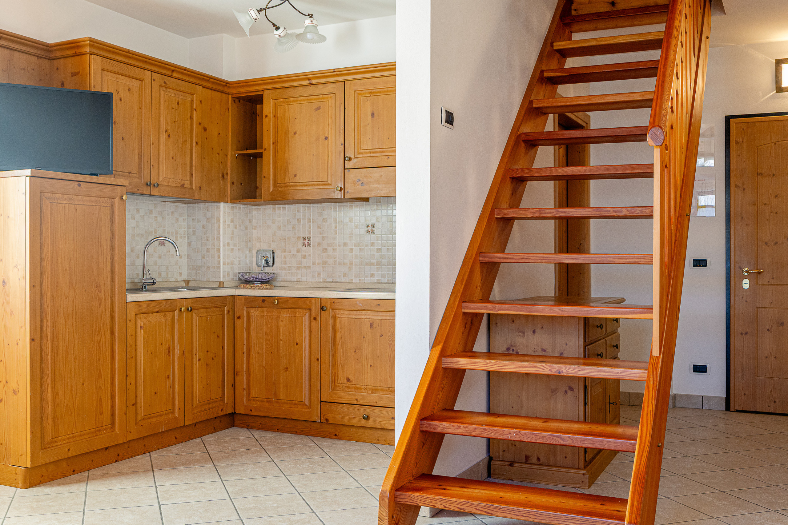 The accommodation opens onto a bright living room with an induction cooking area, and is completed by a double bedroom and a modern bathroom. The interiors are carefully detailed, with an intimate and relaxing atmosphere, perfect for unwinding.