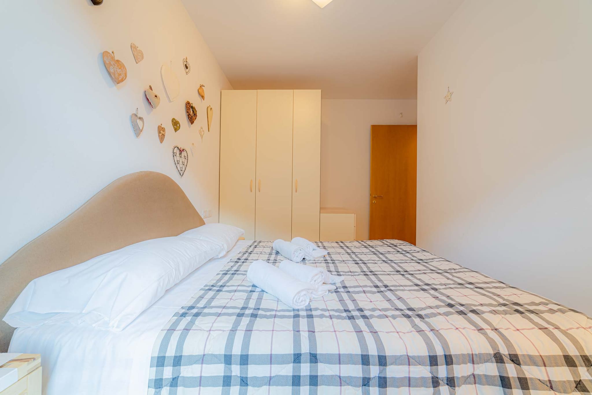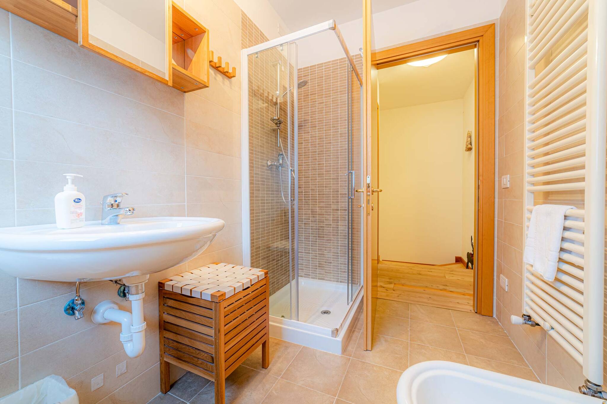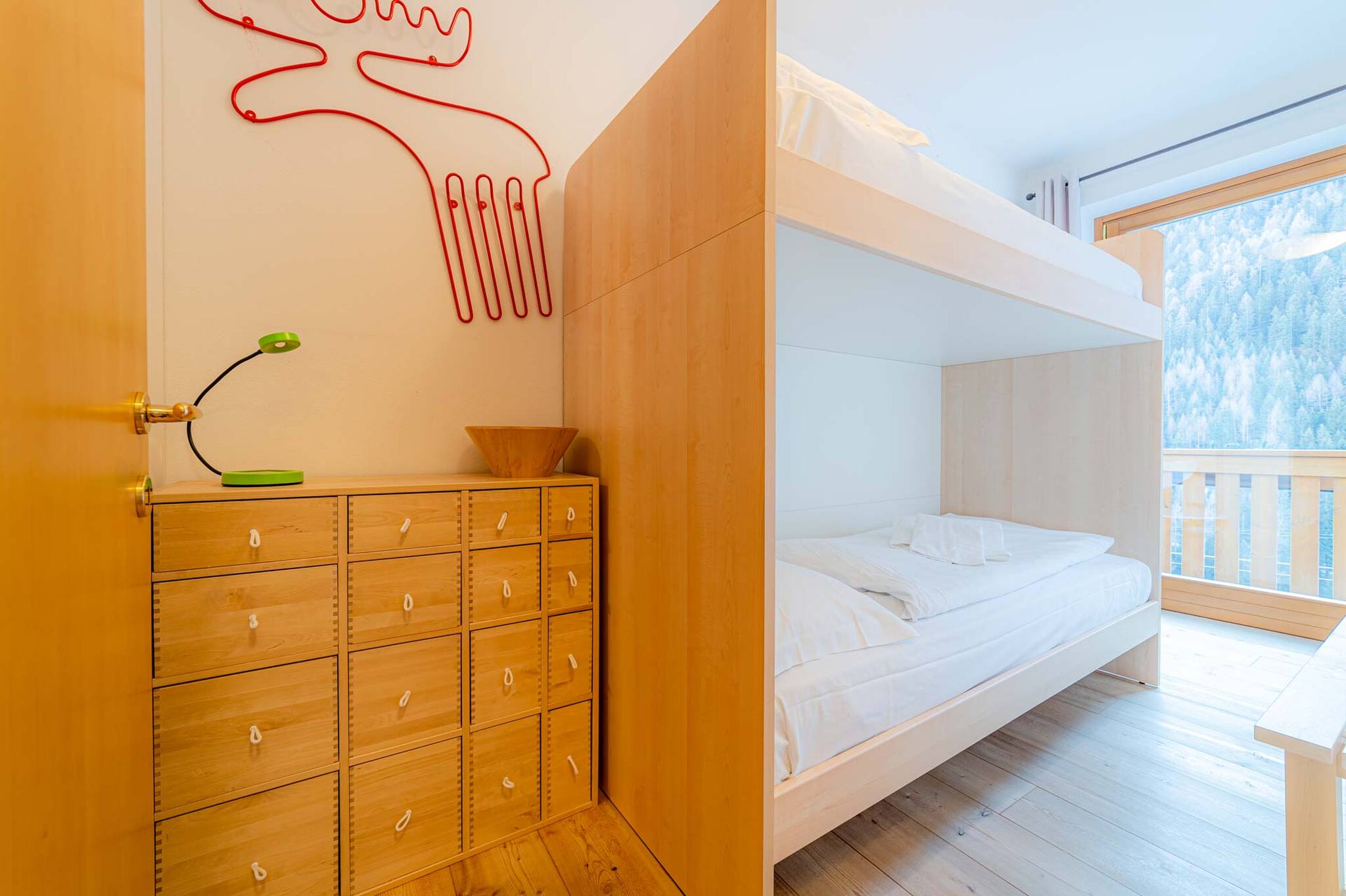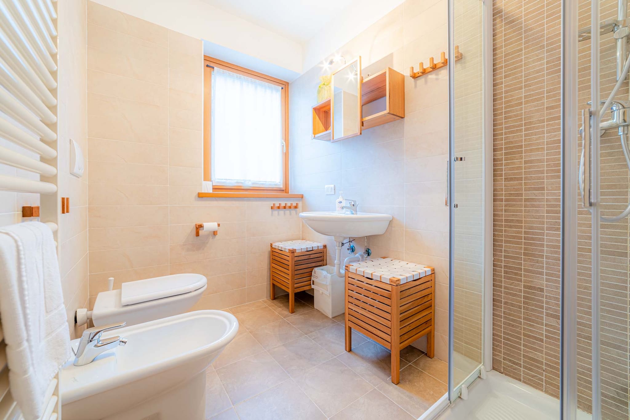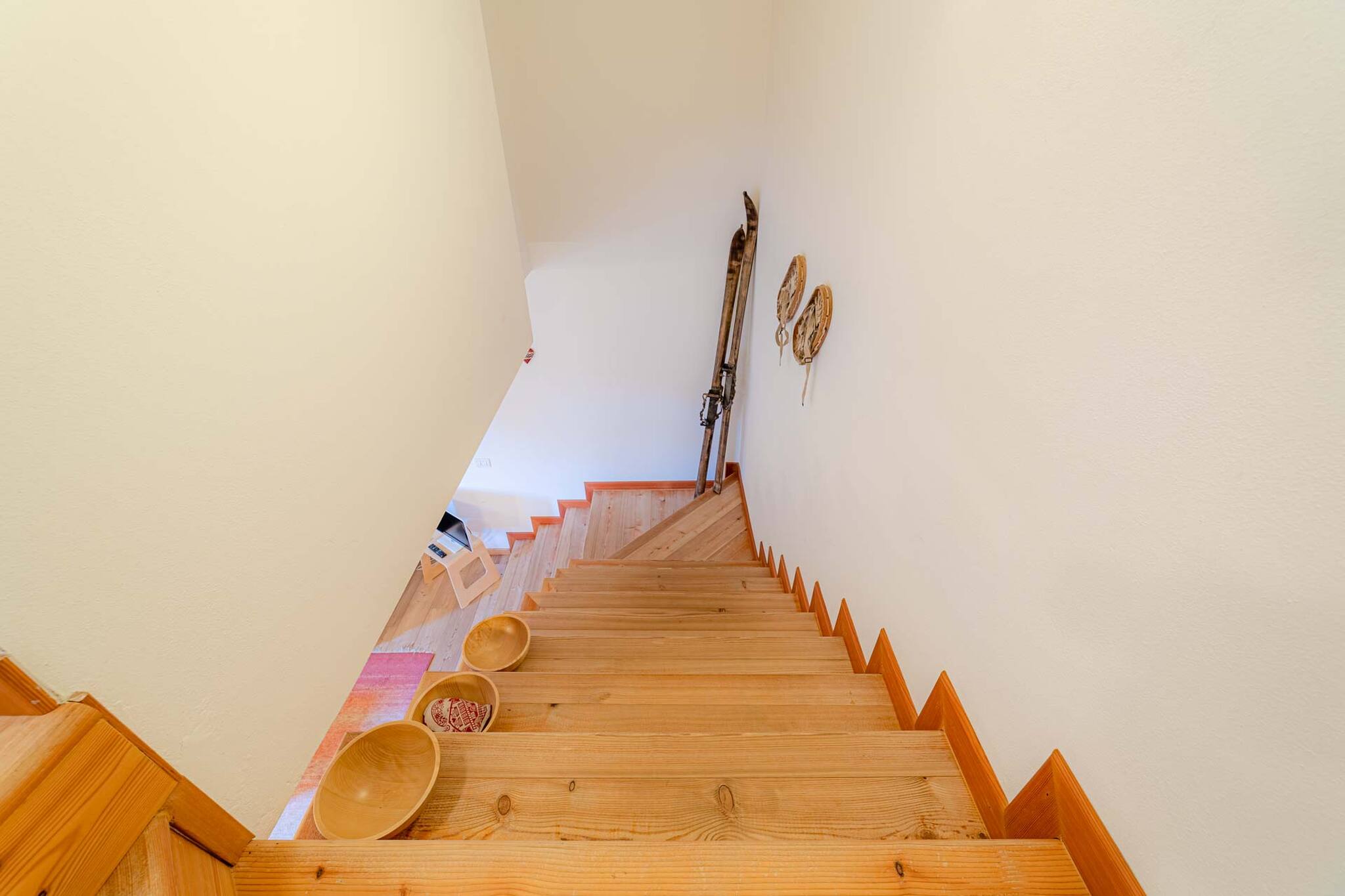 Distributed over two levels, this cosy three-room apartment can accommodate up to four people. On the ground floor are the equipped kitchen and a bright living room with dining area, as well as a first functional bathroom. Going up to the upper floor, you access the sleeping area, consisting of a double bedroom, a second small room with bunk beds and a second bathroom with shower. The spaces are simple but well-kept, designed to offer comfort after an active day of hiking or skiing.