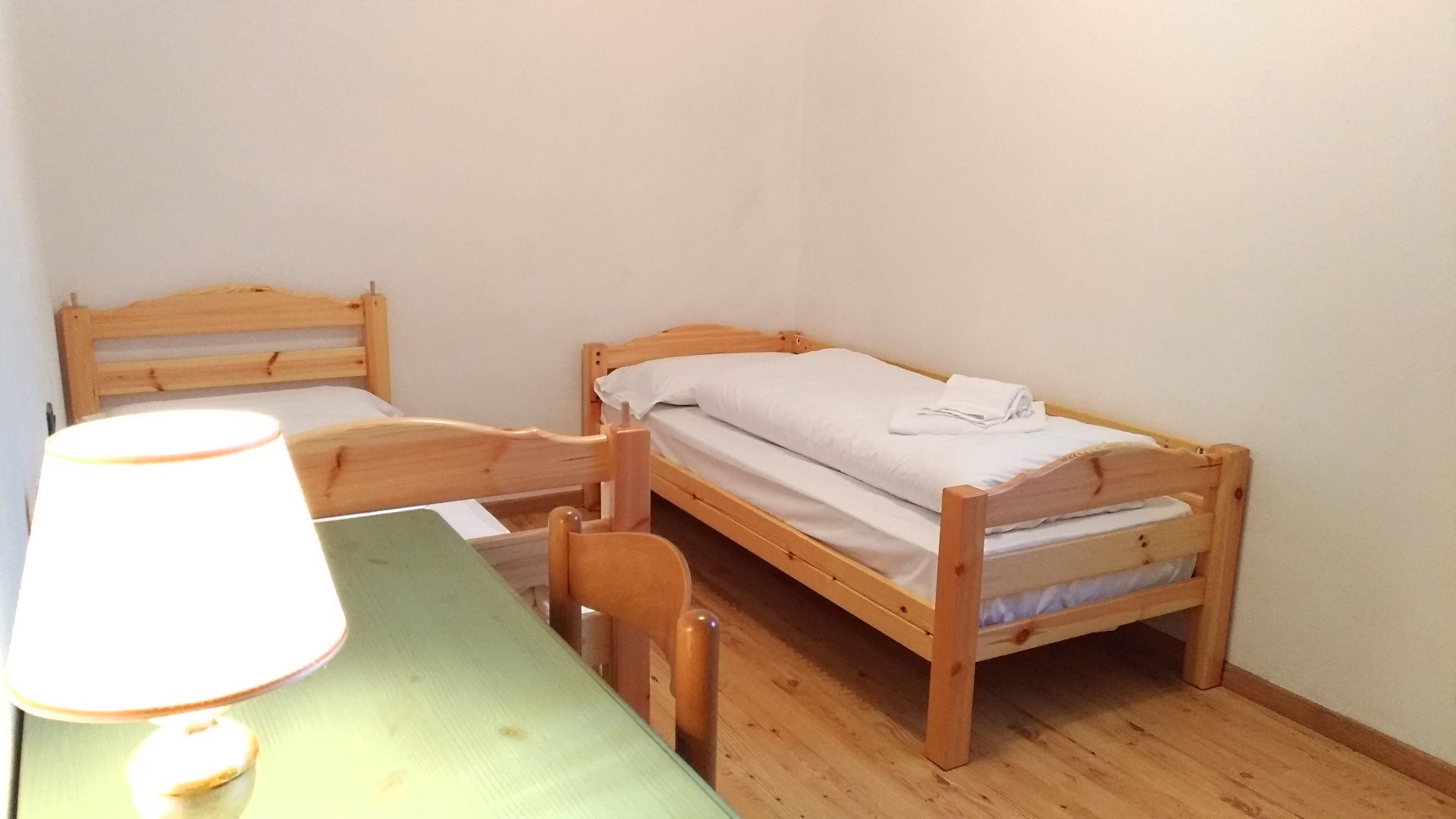 entrance, living room with kitchenette equipped with dishwasher, double bedroom, room with two single beds, bathroom with shower.