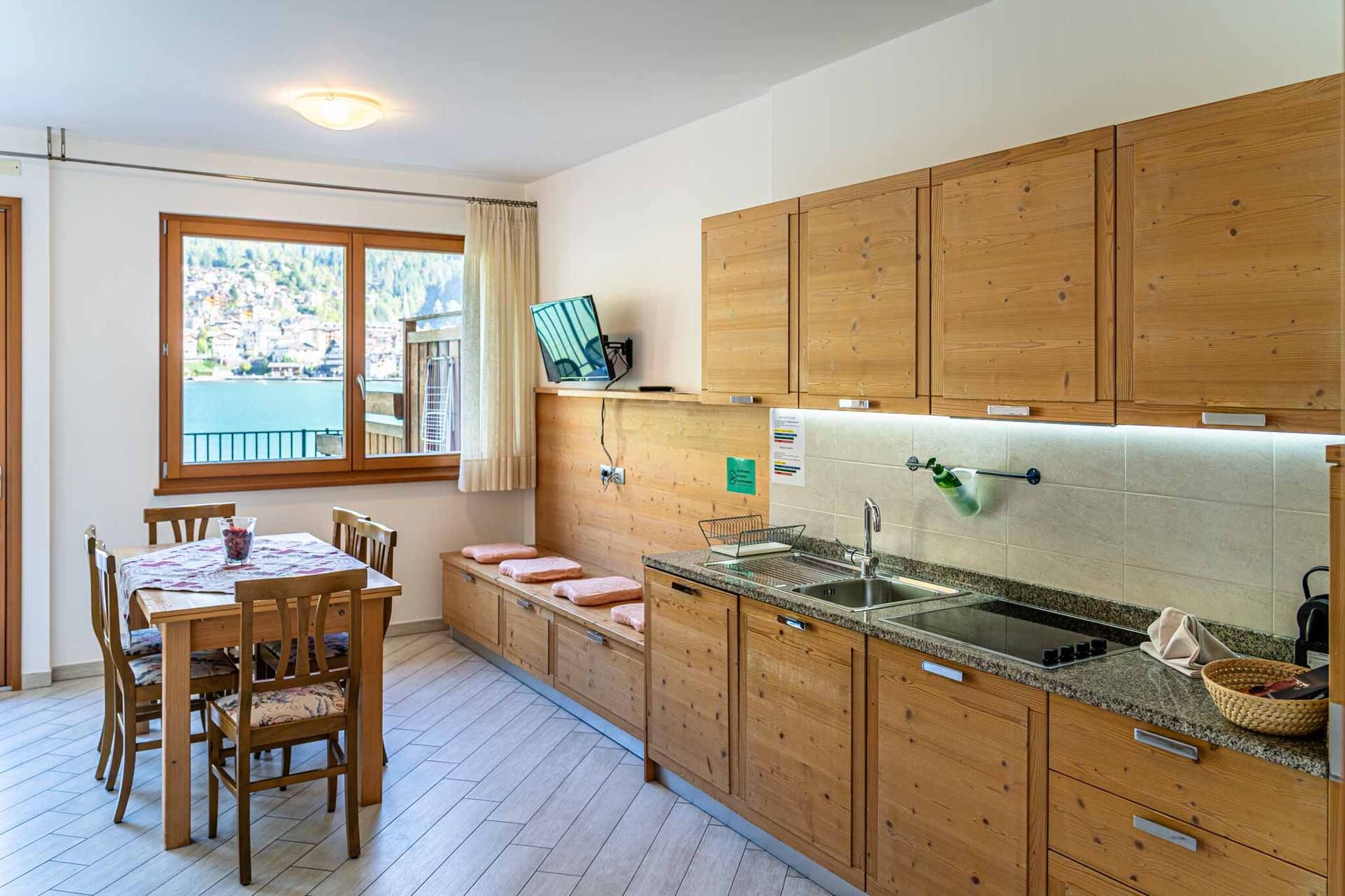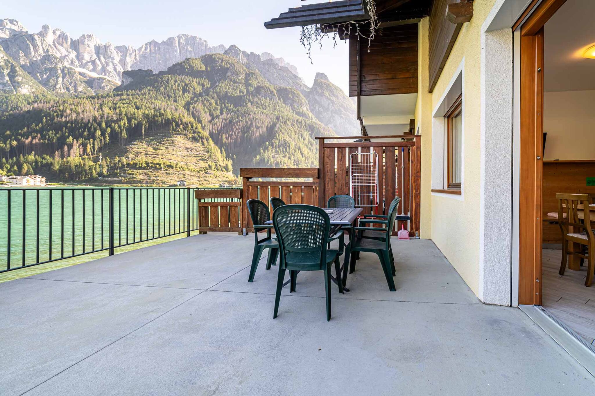 This apartment has 2 bedrooms, a sofa bed in the living room and a large terrace overlooking the lake to sunbathe, eat outdoors, admire the sunset on Civetta which in the evening becomes pink (a spectacle)