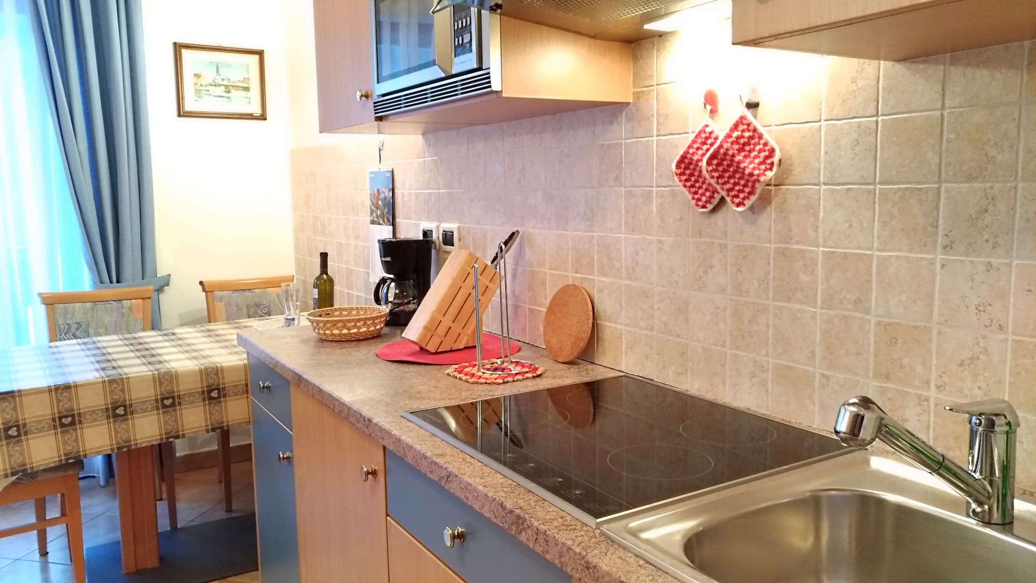 The kitchen is equipped with everything you need: an induction hob, microwave oven, American coffee machine, crockery and utensils. A practical and welcoming environment to feel at home even on holiday.